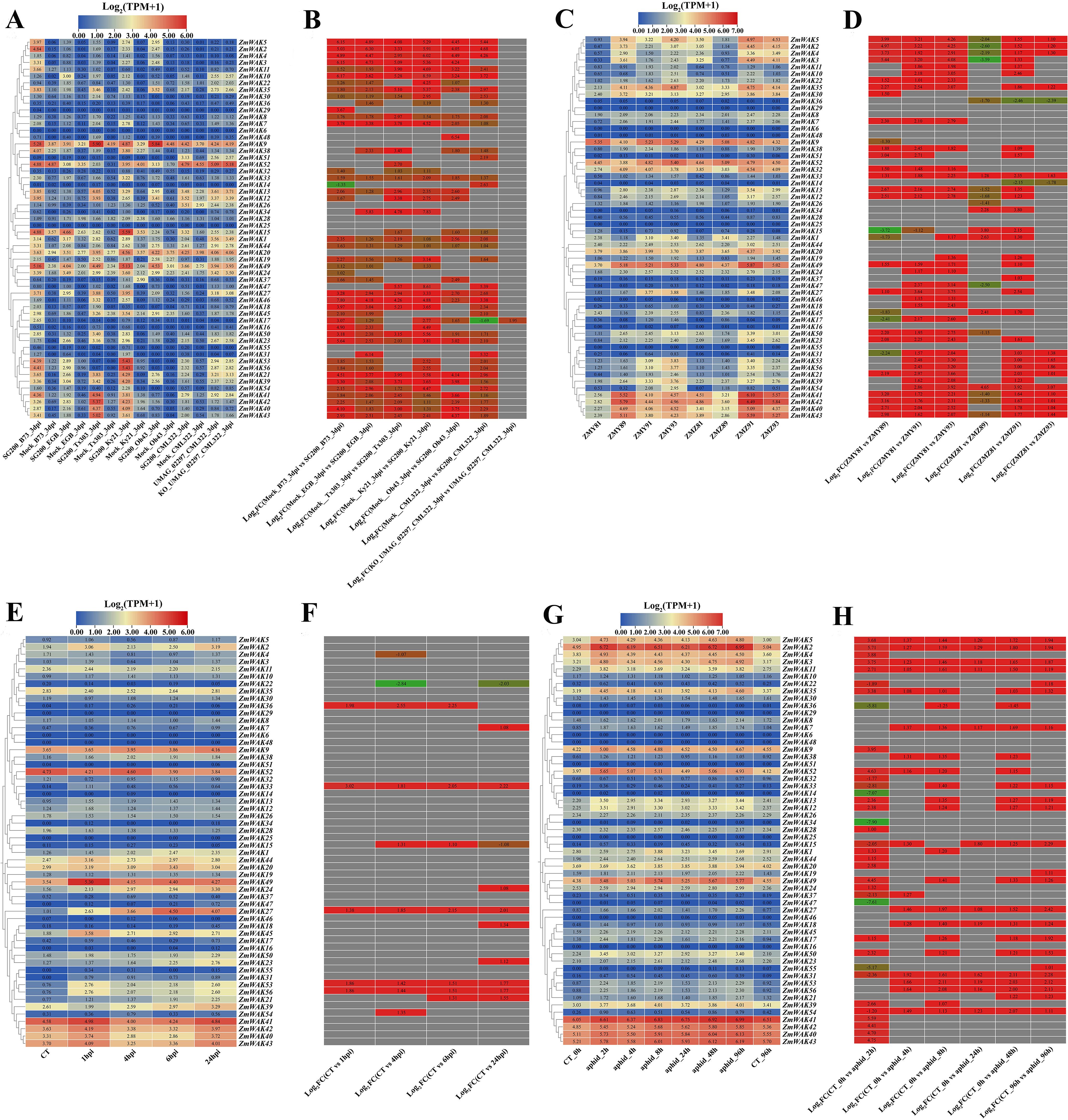 Figure 9. Maize WAK gene family expression heat map under biotic stress. (A) Expression pattern of maize ZmWAK genes under smut stress. SG 200 and UMAG_02297 are strains of the active vegetative fungus, which lead to maize smut. KO_UMAG_02297 is a mutant strain of UMAG_02297. Mock is the simulation control treatment involved uninfected plants. The term 3dpi refers to 3 days after infection. The six maize lines are B73, CML 322, EGB, Ky 21, Oh 43, and Tx 303. (B) Expression fold changes of the maize WAK gene family under smut stress. (C) Expression pattern of maize ZmWAK genes under gray leaf spot stress. ZMY represents the resistant inbreed line ‘Yayu 889’ and ZMZ represented the susceptible inbreed line ‘Zheng Hong 532’, they are sown in an field infected by Mycosphaerella maydis and the leaves of the infected plants are collected at 81, 89, 91, and 93 days after planting. (D) Expression fold changes of the maize WAK gene family under gray leaf spot stress. (E) Expression pattern of maize ZmWAK genes under beet armyworm stress. CT represents the uninfected plants, 1hpi represents 1 hour after infection, 4hpi represents 4 hours after infection, 6hpi represents 6 hours after infection, 24hpi represents 24 hours after infection. (F) Expression fold changes of the maize WAK gene family under beet armyworm stress. (G) Expression pattern of maize ZmWAK genes under aphid stress. CT_0h and CT_96h represent uninfected plants at 0 hour and 96 hours. aphid_2h, aphid_4h, aphid_8h, aphid_24h, aphid_48h, and aphid_96h represent infected plants at 2, 4, 8, 24, 48 and 96 hours, respectively. (H) Expression fold changes of the maize WAK gene family under aphid stress. There are two figures in each stress treatment—the left figure represents the log2(TPM + 1) and the right figure represents the log2 (Fold Change), indicated in red for up-regulation and green for down-regulation. When the absolute value of log2(Fold Change) is greater than 1, it will be shown in the figure.