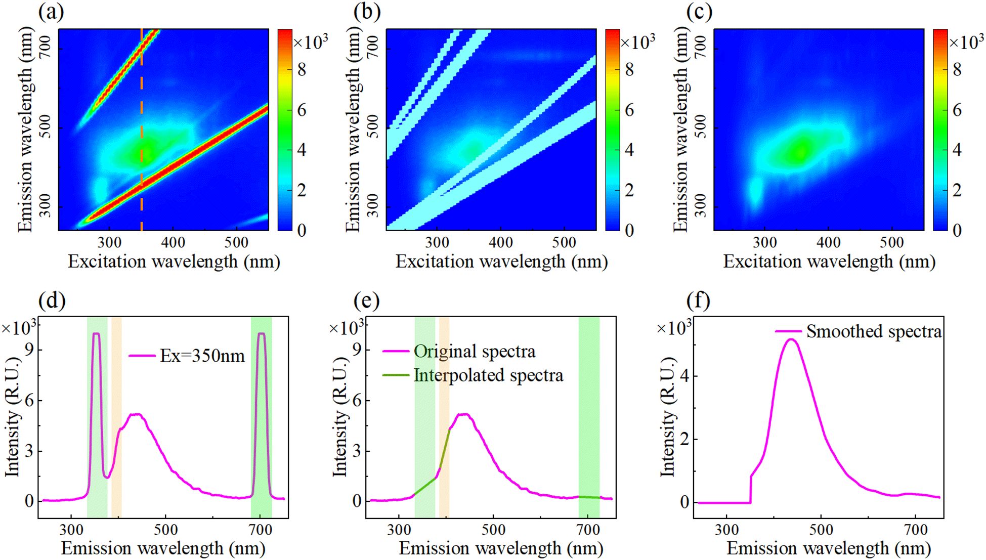 Figure 1. Pretreatment for removing fluorescence scattering peaks. (a) Original EEMF spectra, (b) Remove scattering, (c) Fitted EEMF spectra, (d) Original emission spectra, (e) Scattering removal and interpolated spectra, and (f) Smoothed spectra.