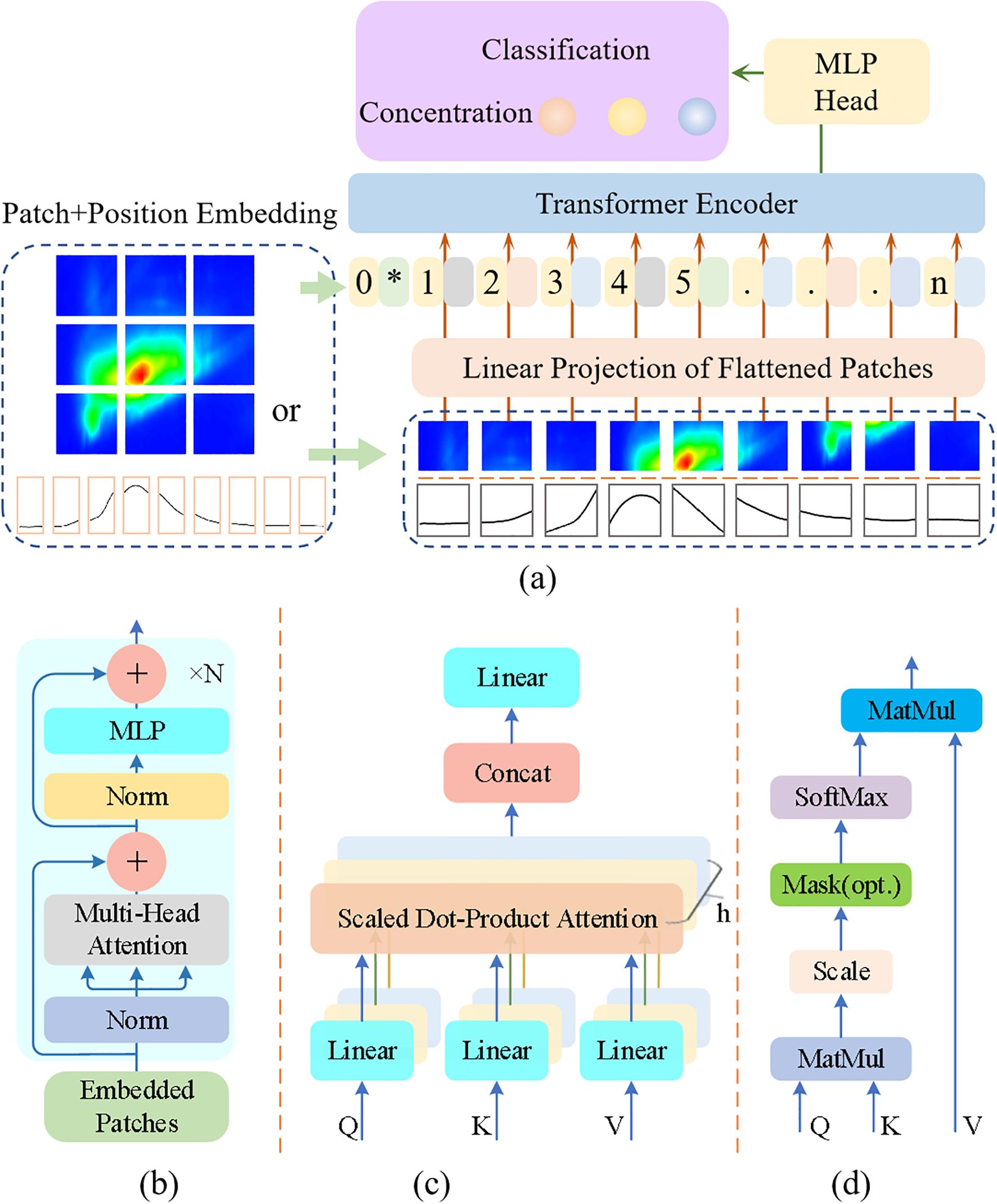 Figure 2. The framework of improved VIT model. (a) Proposed VIT model, (b) Transformer Encoder, (c) Multi-Head Attention, and (d) Scaled Dot-Product Attention.