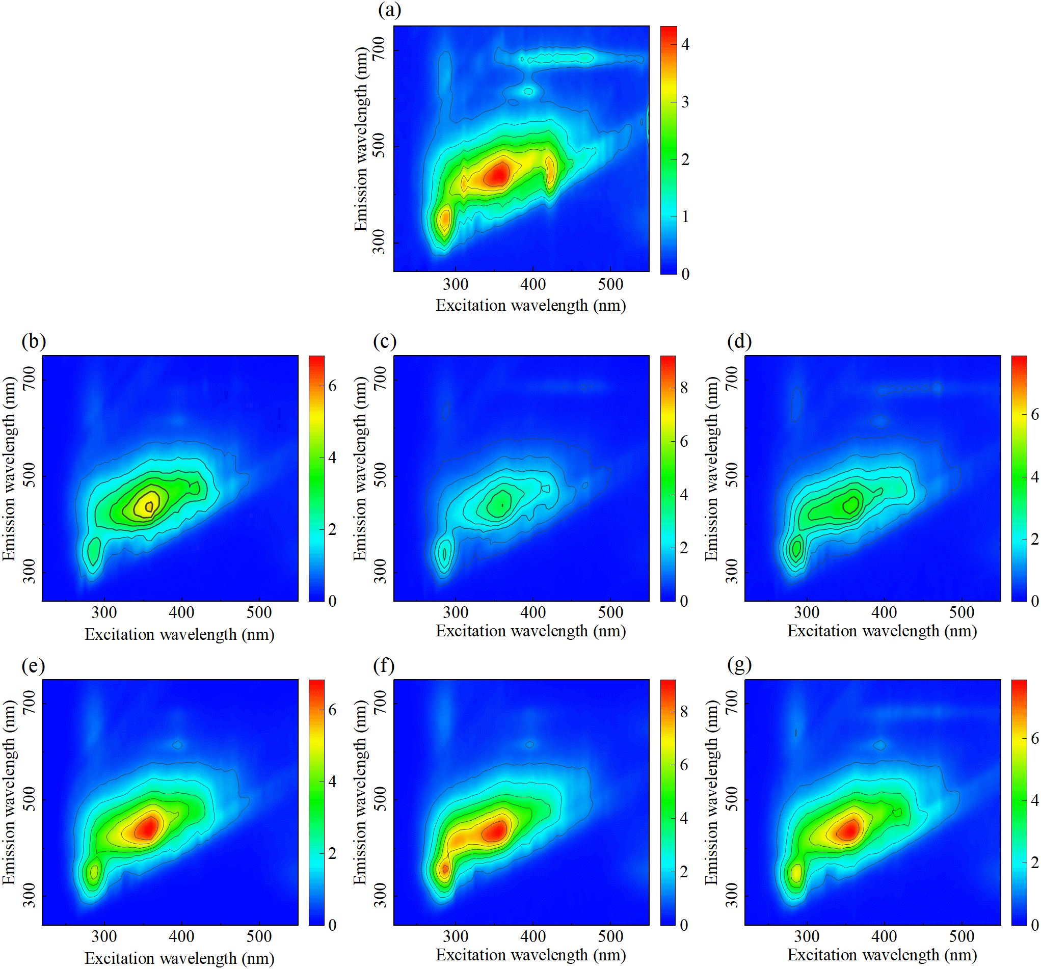 Figure 3. EEMF spectra of root exudates treated with different concentrations and types of MPs. (a) Control, (b) 10 mg/L PET, (c) 10 mg/L PS, (d) 10 mg/L PVC, (e) 100 mg/L PET, (f) 100 mg/L PS, and (g) 100 mg/L PVC.