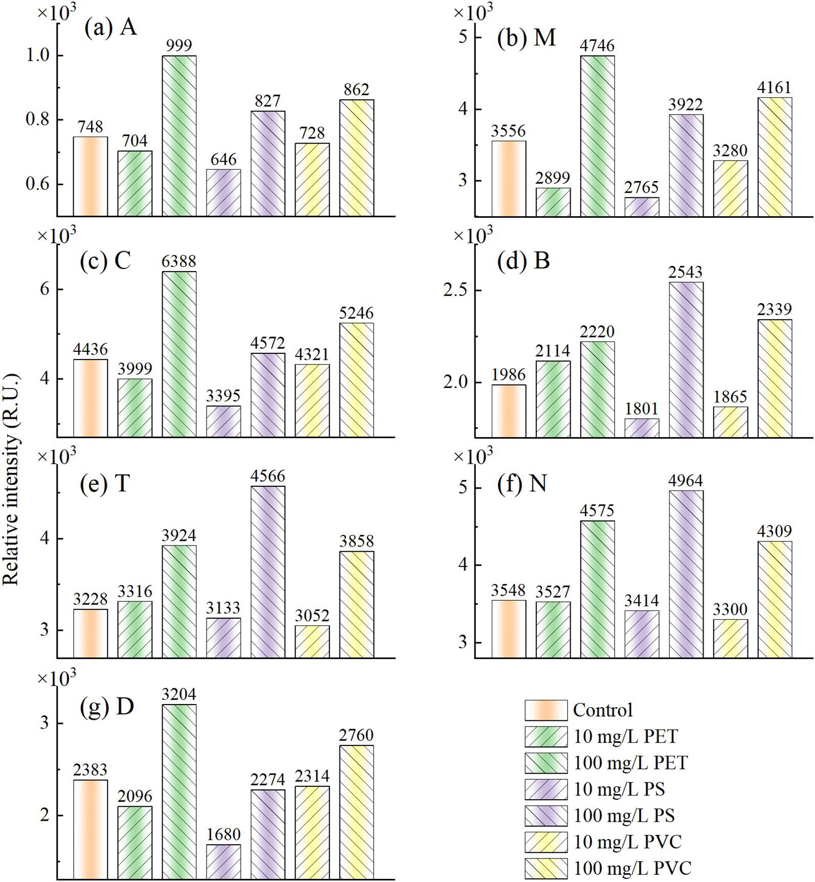 The intensity of fluorescence peaks was calculated using peak method, including UV humic acid (A, Ex/Em=260/400-460 nm), marine humic acid (M, Ex/Em=290-310/370-410 nm), visible humic acid (C, Ex/Em=320-360/420-460 nm), tyrosine like (B, Ex/Em=275/305 nm), tryptophan like (T, Ex/Em=275/340 nm), phytoplankton related (N, Ex/Em=280/370 nm), and fulvic acid (D, Ex/Em=390/509 nm). Figure 4 shows the mean intensities of each fluorescence peak in the EEMF spectra of the seven sample groups. Among them, orange represents the control group, while green, purple, and yellow represent PET, PS, and PVC stress, respectively. Left and right sloping stripes represent the stress concentrations of 10 mg/L and 100 mg/L, respectively. Under low concentration (10 mg/L) stress, the fluorescence peak intensities of A, M, C, N, and D were all lower than those of the control group. The fluorescence peak intensities of B and T were higher than those of the control group under PET stress, while they were lower than those under PS and PVC stress. This indicates that low concentrations of PS and PVC have a weak inhibitory effect on the release of amino acid substances and may even promote their release. Under high concentration stress (100 mg/L), all three MP types exhibited elevated fluorescence peak intensities at regions A, M, C, B, T, and N compared to controls, indicating concurrent inhibition of root exudate production and enhanced spectral response. The fluorescence peak intensity of D increased under PET and PVC stress, while it decreased under PS stress. This phenomenon may be related to the benzene ring structure of PS promoting the antioxidant capacity of rice.