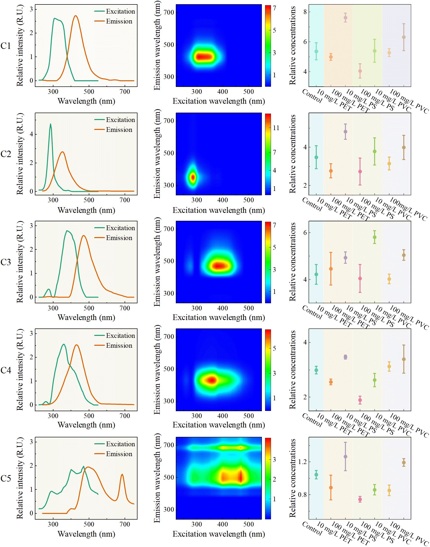 The variation of relative concentrations (fluorescence intensity) of EEMF spectra is shown in the third column of Figure 5. Relative concentrations of each component increased with the increase of MPs concentration from 10 mg/L to 100 mg/L, which reflects that MPs promote the accumulation of various fluorescent substances in root exudates. In most cases, the relative concentrations of low concentration stress were lower than that of the control group, while the relative concentrations of high concentration were higher than that of the control group, except in some special cases. This phenomenon is consistent with the result of the peak method analysis, which provides a basis for identifying MPs stress based on the changes in the fluorescent components of the root secretions of rice seedlings.