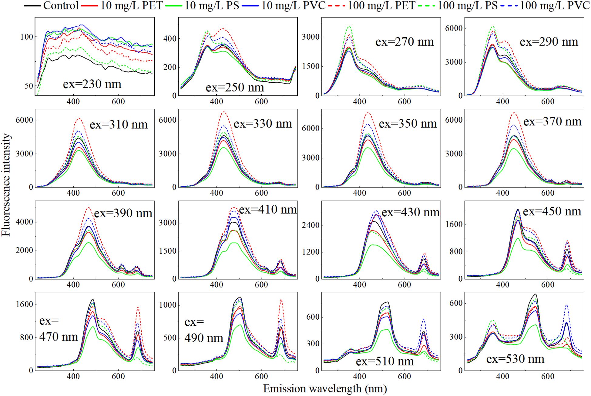 Due to the huge amount of EEMF spectra data, a single sample contains 34,237 parameters (excitation wavelength 67× emission wavelength 511), which poses a huge challenge for rapid detection. The excitation wavelength can excite the fluorescence in the sample and directly affect the generation and detection of fluorescence. Therefore, determining the excitation wavelength characterizing root exudates is a key step in actual detection. Figure 6 shows the emission spectra at the excitation wavelength with an excitation interval of 20nm. With the increase of the excitation wavelength, the maximum intensity of the fluorescence peak gradually increases. When the excitation wavelength is 350 nm, the fluorescence peak reaches its strongest and then gradually weakens. Further analysis revealed elevated fluorescence intensity in the high-concentration MP group relative to controls across 250-410 nm excitation wavelengths, while the low-concentration group showed depressed intensity. Between 410 nm and 450nm, the fluorescence intensities of the high-concentration and low-concentration groups crossed. When the excitation wavelength is greater than 450 nm, the control group is at the top, the low-concentration group is in the middle, and the high-concentration group is at the bottom. This regular change indicates that the selection of excitation wavelengths has an important influence on distinguishing different MPs stress concentrations.