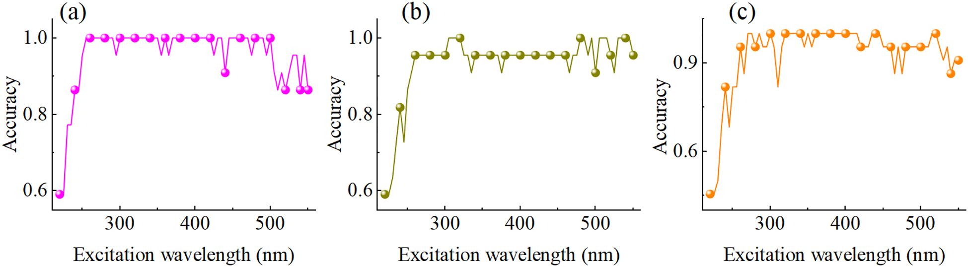 Figure 7. Detection accuracy of models under different excitation wavelengths. (a) PET, (b) PS, and (c) PVC.