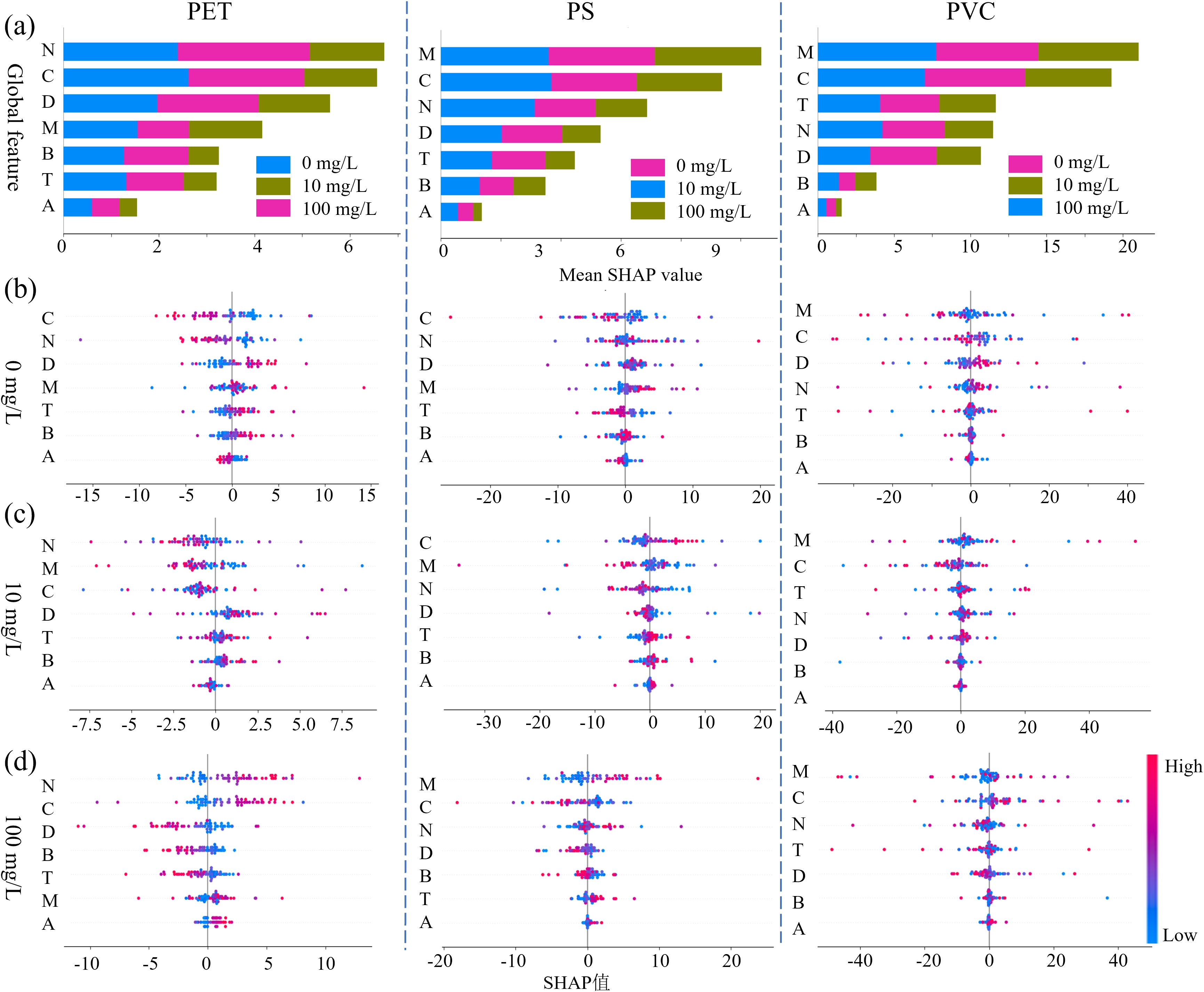 Figure 8. Feature importance distribution based on SHAP values for (a) the overall dataset, (b) the control group, (c) the 10 mg/L group, and (d) the 100 mg/L group.
