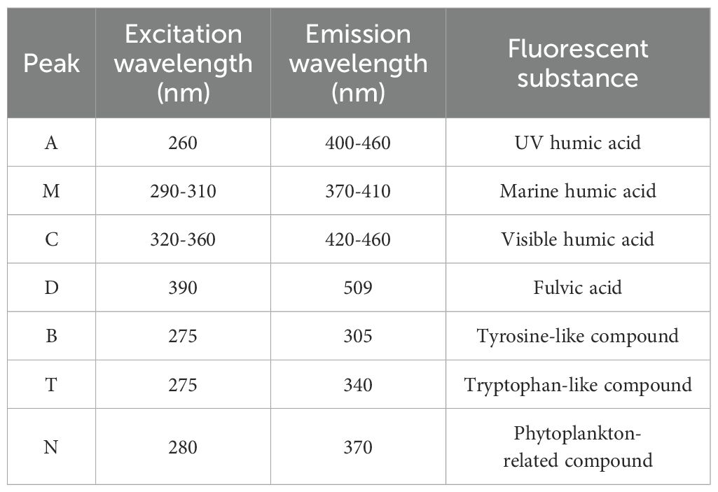 Peak method extracts the fluorescence intensity of specific peak locations/regions and characterizes fluorescence components of EEMF spectra (Komatsu et al., 2025). In this study, the EEMF spectra of rice root exudates revealed multiple characteristic peaks, which were associated with complex organic compounds present, including amino acids, phenolic compounds, and humic acids. To analyze the fluorescence characteristics of the root exudates, seven primary fluorescent substances were selected for investigation. The locations of the respective fluorescence peaks and detailed information on their corresponding substances are presented in Table 1. The peak method effectively reveals variations in the content of different fluorescent components, making it an efficient approach for the rapid fingerprinting of root exudates.