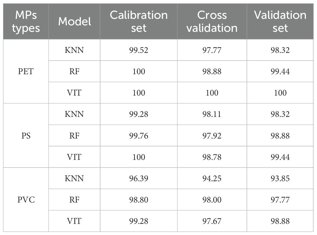 Three representative models ranging from simple to complex, KNN, RF and VIT, were adopted to predict the MPs stress concentration, and the results are shown in Table 2. The EEMF spectra is reshaped into one-dimensional vectors and input into the KNN and RF models for model establishment, and the two-dimensional matrix of EEMF spectra is used for VIT model development. As a simple model, the accuracy rate of KNN in concentration detection is 93.85-98.32%. RF, as an ensemble learning model, demonstrates strong robustness, with an accuracy rate ranging from 97.77 to 99.44%. The most complex VIT model performs the best, and the accuracy rate of the validation set generally exceeds 98.88%, fully demonstrating its advantages. Overall, models ranging from simple to complex all demonstrated high classification performance, and the model complexity showed a positive correlation trend with the accuracy rate. These results confirm that EEMF spectra of root exudates effectively distinguish MP stress concentrations and demonstrate the discriminatory capability of the proposed VIT model.