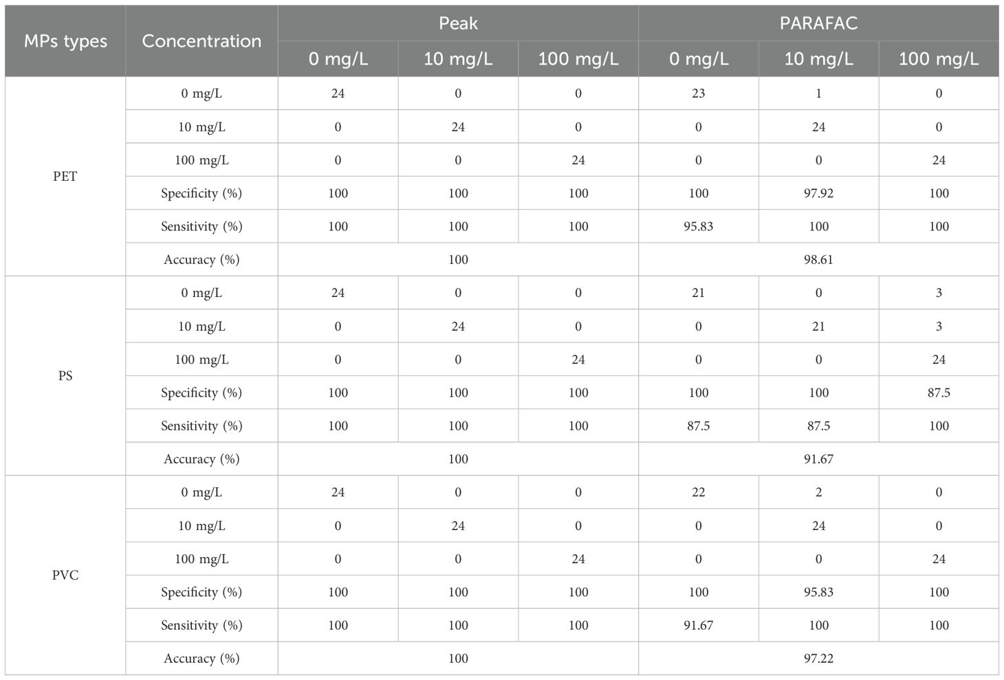 Peak method and PARAFAC extracted 7 and 5 features, respectively, as inputs for the model to distinguish the MPs stress concentration. The results are shown in Table 3. Both methods demonstrated high classification performance in the detection of three MPs types, but there were certain differences in accuracy and stability. The peak method demonstrated perfect classification performance in detection of stress concentration. The specificity, sensitivity and accuracy were all 100%, indicating that it could completely distinguish MPs stress of 0, 10 and 100 mg/L. The specificity of the PARAFAC method in PET detection was 97.92-100%, the sensitivity was 95.83-100%, the accuracy rate was 98.61%, and only one sample was misjudged. The specificity of PS MP detection was 87.5-100%, the sensitivity was 87.5-100%, and the accuracy rate was 91.67%. There are cases where samples of 0 and 10 mg/L are mistakenly judged as 100 mg/L. In PVC MP detection, there were two samples of 0 mg/L that were misjudged as 10 mg/L, but still maintained relatively high classification performance. The peak method demonstrated excellent performance in concentration detection, with specificity, sensitivity and accuracy generally reaching 100%. Although the overall performance of the PARAFAC method was slightly lower than that of the peak method, its accuracy still remained between 91.67% and 98.61%.