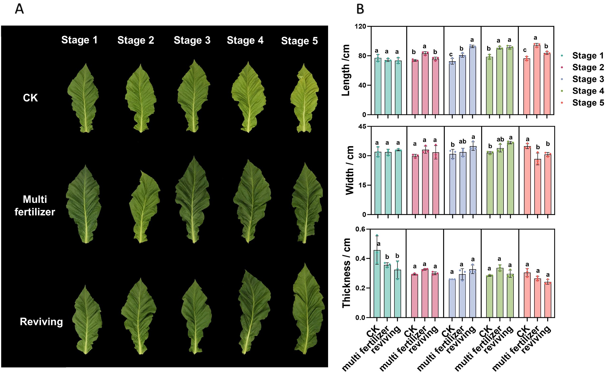 Figure 1. Growth status of tobacco leaves with different quality attributes across developmental stages. (A) Visual representation of the growth status of three tobacco leaf categories (normal, multi fertilizer, and reviving) across the five developmental stages. (B) Bar charts depicting the variations in leaf length, leaf width, and leaf thickness of the three tobacco leaf categories across the five developmental stages. a, b, and c represent the results of the significance difference analysis. If the groups do not contain the same letter, it indicates a significant difference between the groups, while if the groups contain the same letter, it indicates no significant difference between the groups.