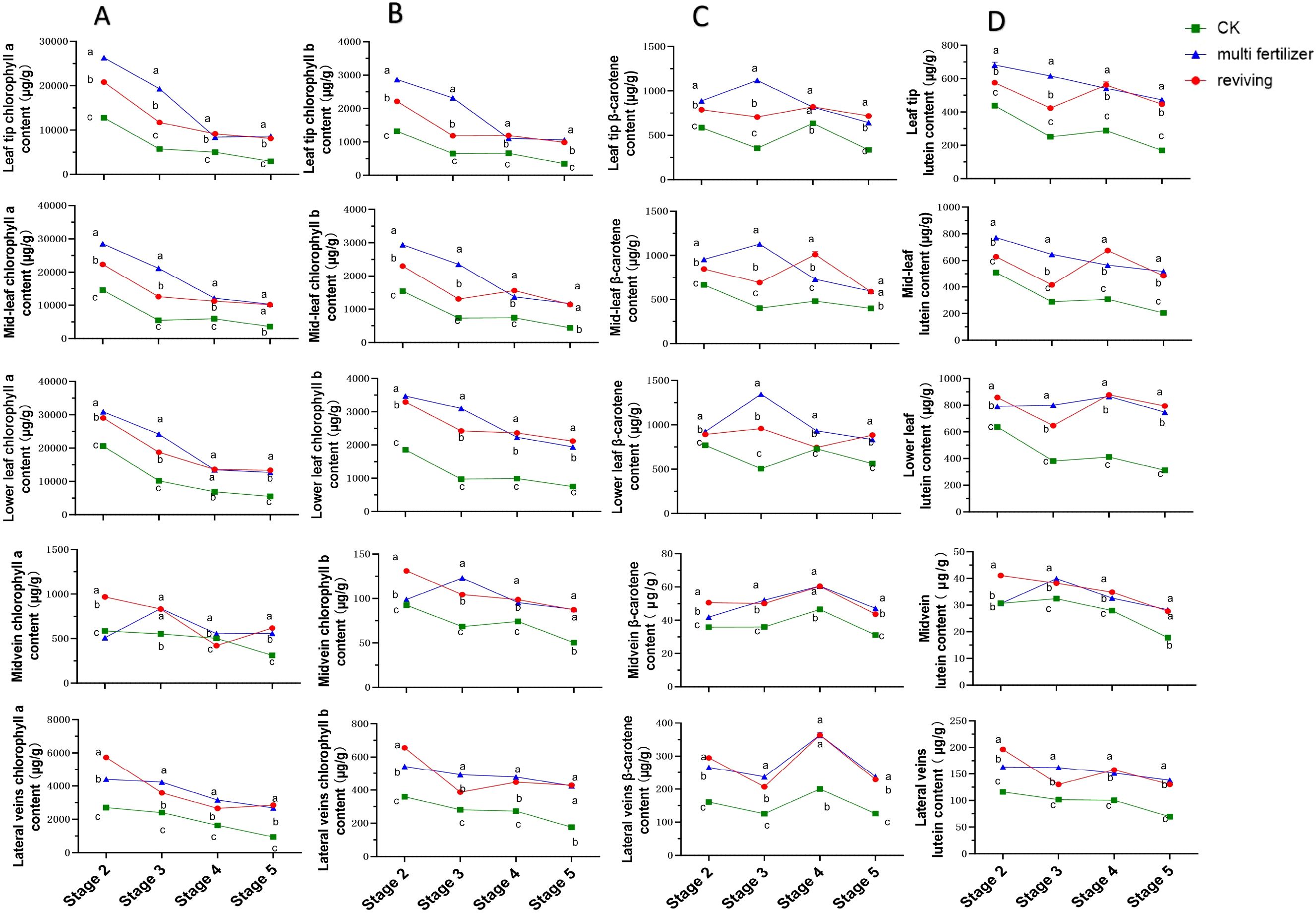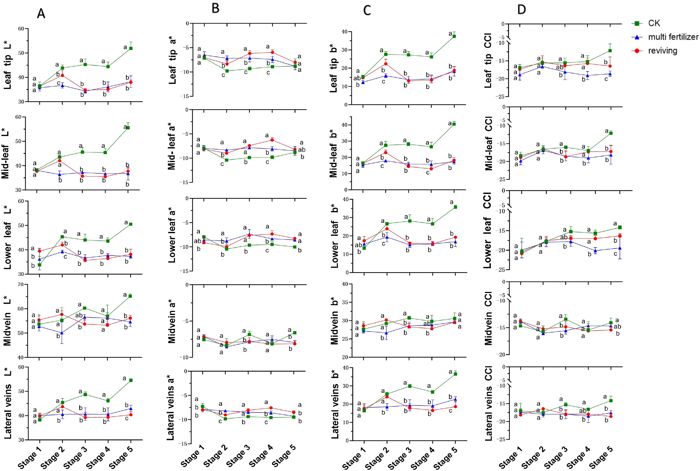 Longitudinal comparisons of L* values across stages 2–5 revealed that normal mature tobacco leaves maintained significantly higher L* values in all segments compared to multi fertilizer and reviving tobacco leaves. The L* differences between multi fertilizer and reviving tobacco leaves were largely non-significant, suggesting that normal mature tobacco leaves retained greater lightness during development. This aligns with their concurrent reduction in chlorophyll content, which typically correlates with brighter leaf appearance.