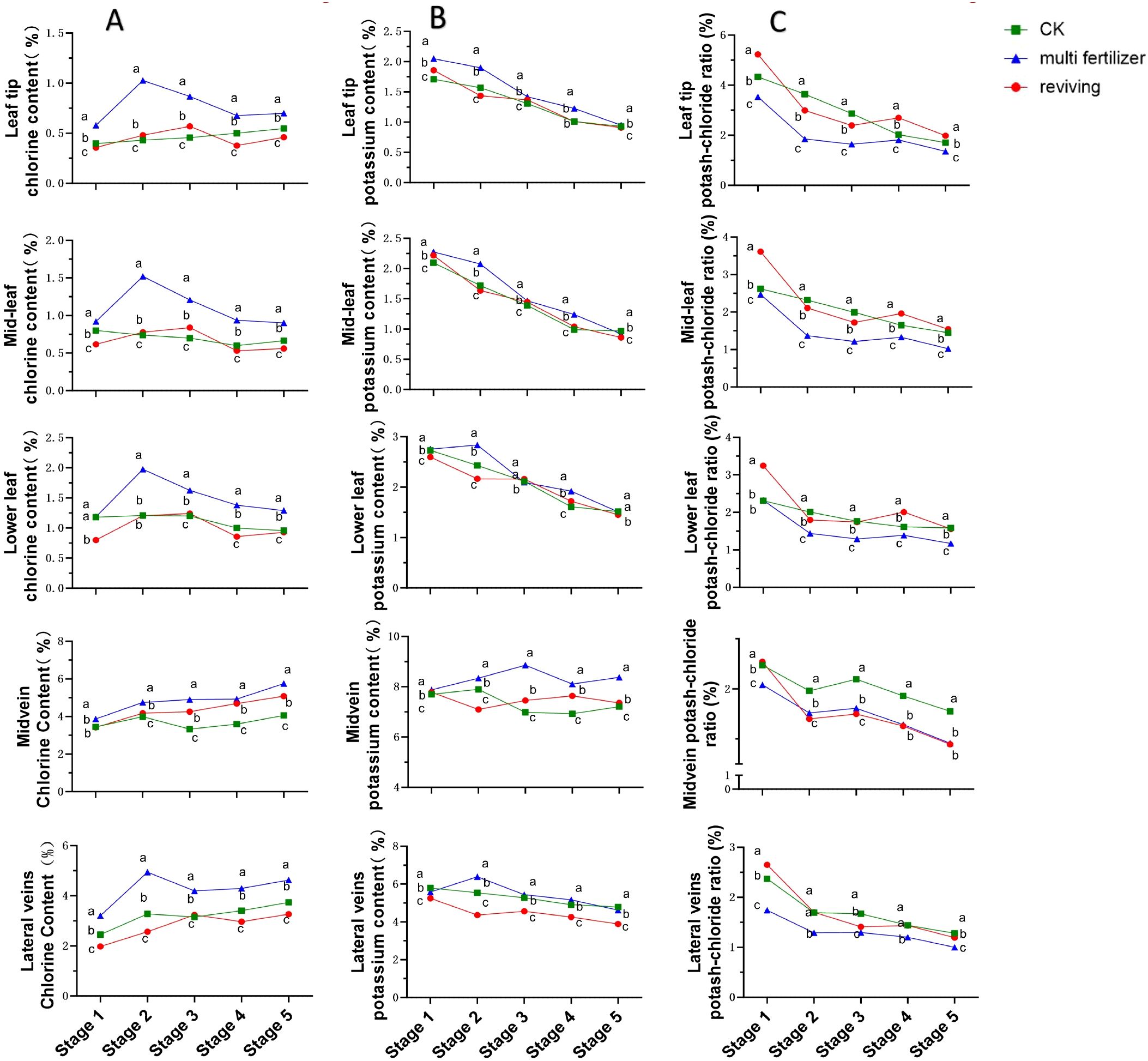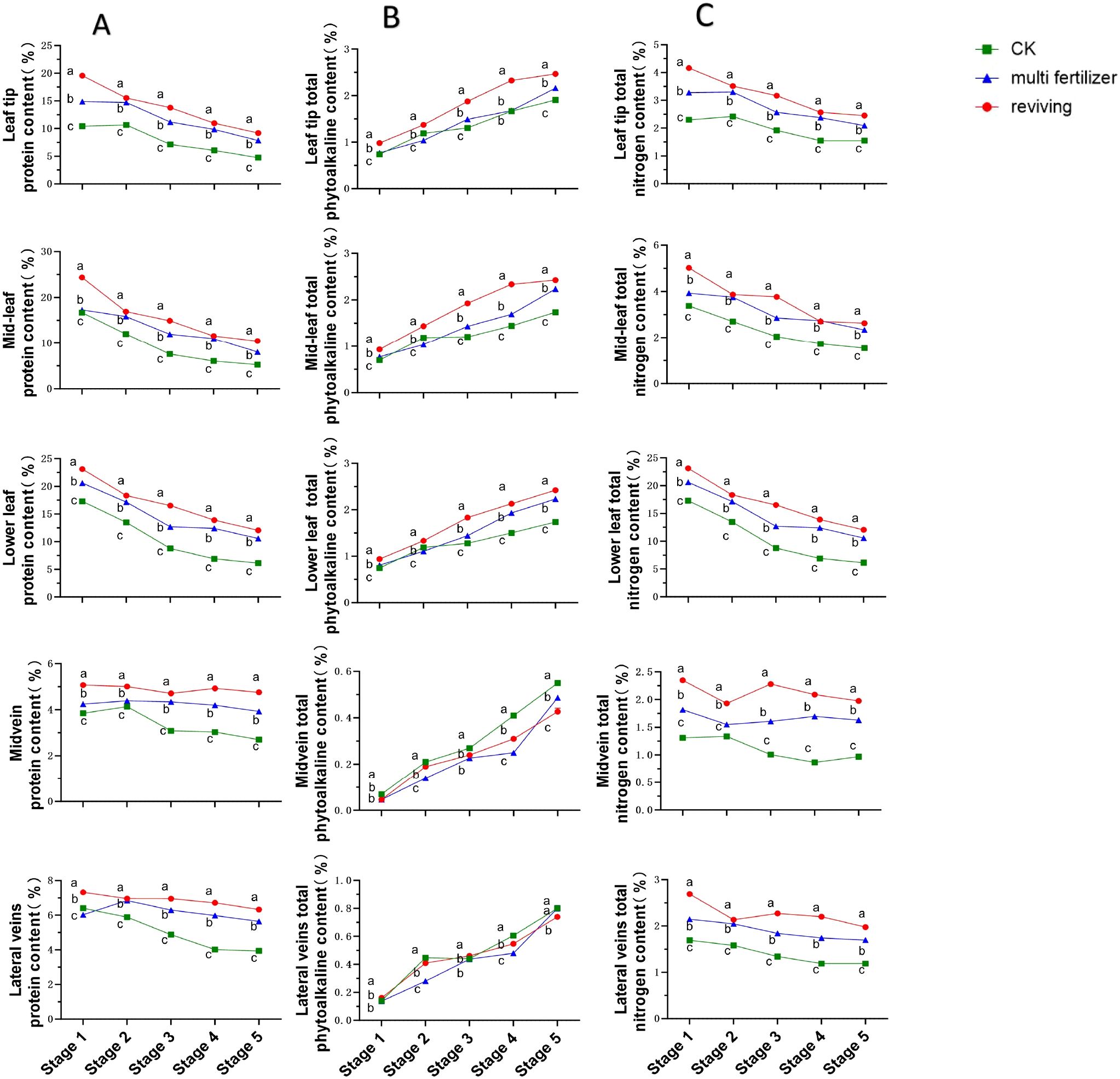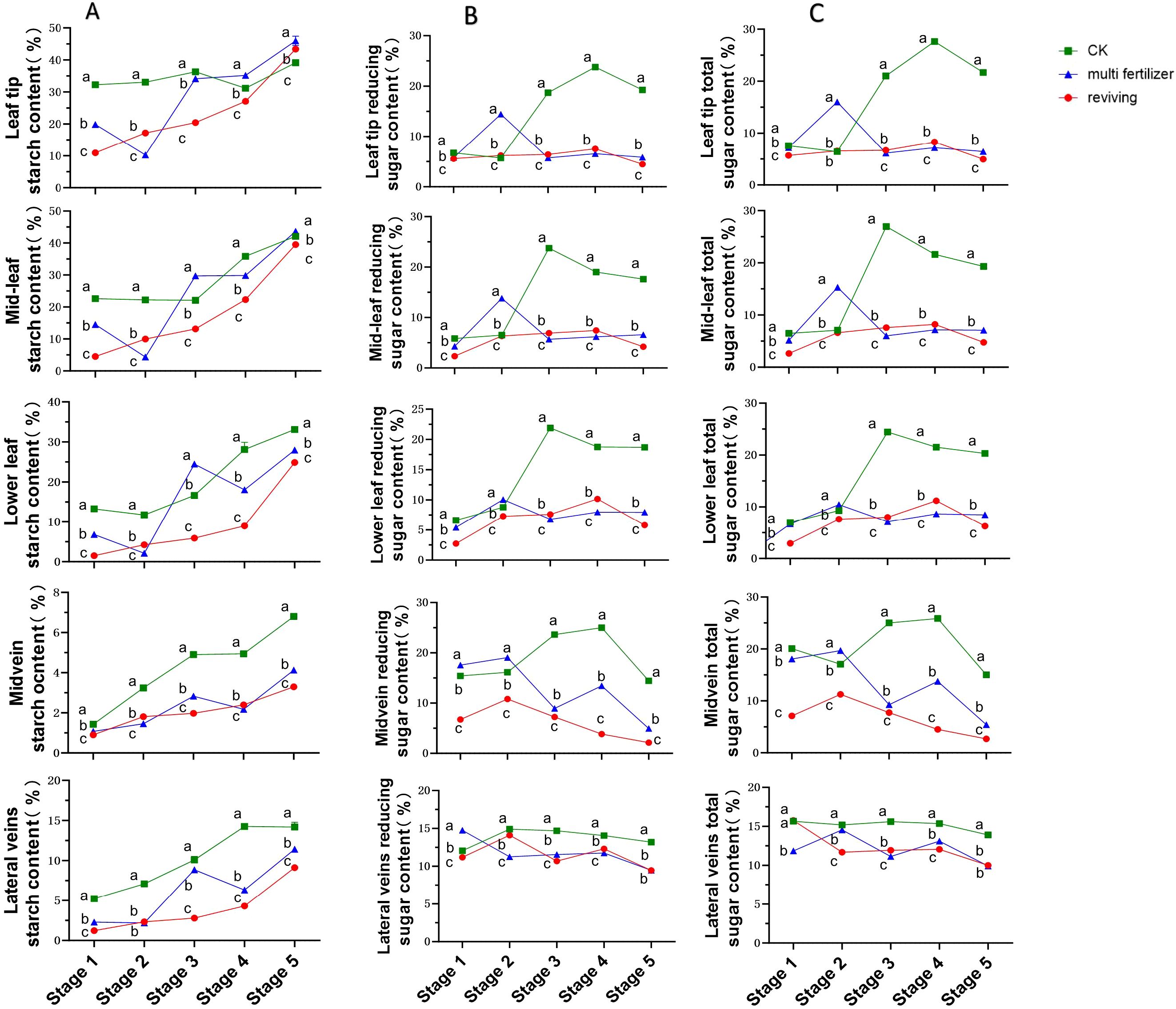Samples were collected and tested at five time points at 7-day intervals, specifically: two weeks before topping (June 25), one week before topping (July 2), at the topping stage (July 9), one week after topping (July 17), and two weeks after topping (July 24). Each time, 30 disease-free tobacco leaves were selected and divided into three groups (A, B, C), with 10 leaves per group to serve as biological replicates. For each sampling instance, the selected location is the fifth leaf from the top of the topping site on individual tobacco plants. Each leaf was rapidly sectioned into five parts (Leaf tip, mid-leaf, lower leaf, midvein, and lateral veins), immediately frozen in liquid nitrogen and pooled. Subsequently, each group was further divided into two equal portions, which were labeled with the sampling time, tobacco leaf variety designation, and specific leaf section. Then stored at -80°C for subsequent analysis of conventional chemical constituents (including total sugars, reducing sugars, starch, total nitrogen, total alkaloids, protein, chlorine, and potassium) as well as chlorophyll (a and b), β-carotene, and lutein contents in different leaf sections. Additionally, for each treatment condition (normal, multi fertilizer, and reviving), three additional leaves were photographed on each sampling occasion to measure leaf length, width, and thickness. Thereafter, a portable colorimeter was employed to assess colorimetric values (L, a, b values) across various leaf sections, followed by histological examination of leaf cell structures post-sectioning.
