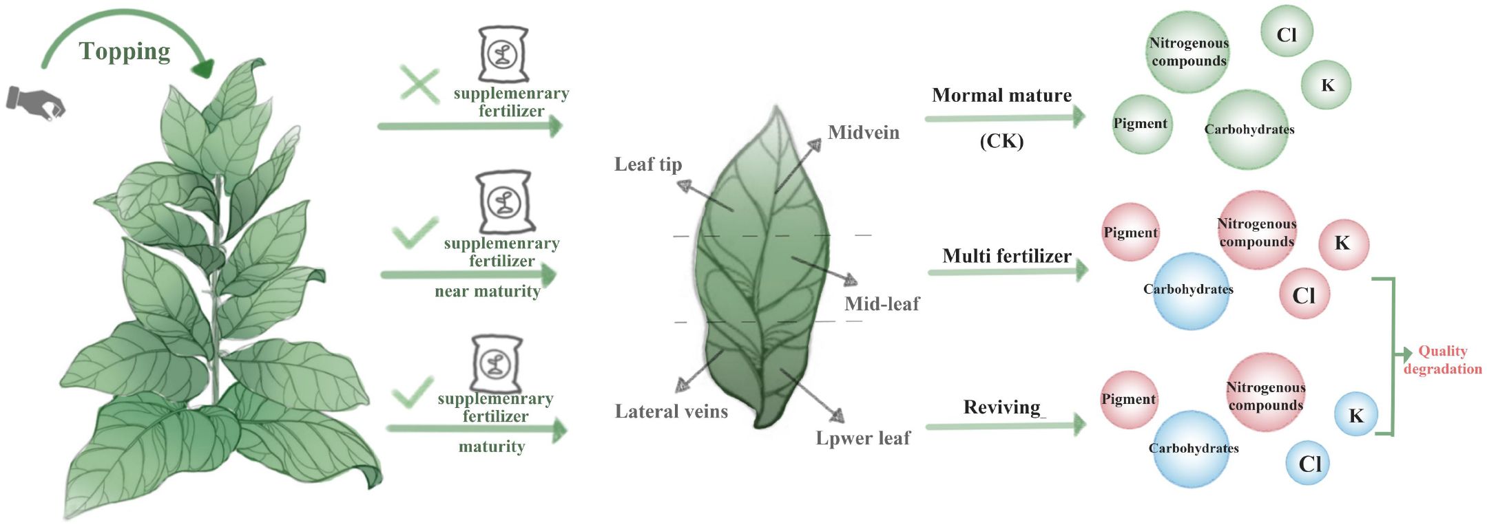 Tobacco, a specialized psychoactive cash crop, exhibits critical quality and economic determinants governed by its internal biochemical composition and yield potential. The developmental stage surrounding topping (removal of the apical meristem) serves as a pivotal window for internal quality formation. During this time, normal mature tobacco leaves diverge significantly in physiological and biochemical traits from two low-quality phenotypes: multi fertilizer and reviving tobacco leaves.