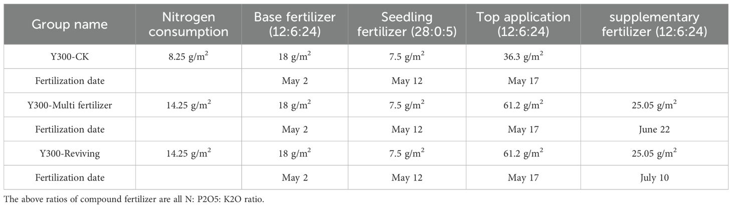 The trial utilized the locally cultivated tobacco variety Yunyan 300, with key phenological stages occurring on April 5 (transplanting) and July 9 (topping). Three experimental treatments were established based on regional fertilization practices:control group (standard fertilization protocol)、”Multi fertilizer” treatment and “Reviving” treatment. Detailed fertilization parameters for each treatment group are systematically presented in Table 1.