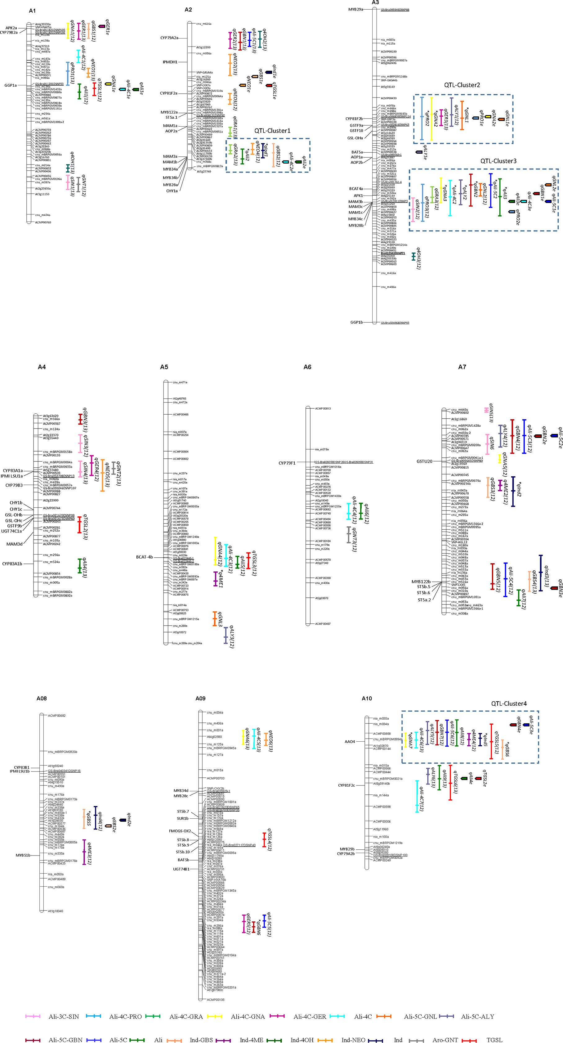The GenStat system was employed to detect QTLs affected by the environment. A total of 29 QTLs were obtained for 13 GSL phenotypes. Except for SIN, GRA, 4OH, and GNT, these QTLs were distributed on chromosomes A01, A02, A03, A07, A08, and A10 (Figure 1; Supplementary Table S7). Among them, six QTLs for six types of GSL displayed significant QTL–environment interactions (Q×E), reflecting the genetic variation underlying their phenotypic plasticity. qGER1e, qGBN4e, qAli-5C3e, and qNEO1e exhibited Q×E effects and were co-localized with their corresponding QTLs only in the 2012SG trial (Figure 1). qPRO1e, qGNA2e, and qGNL1e exhibited no Q×E effects and were mapped to QTL-Cluster2, in which QTLs were detected for PRO, GNA, and GNL in both the 2012SG and 2013AF trials (Figure 1). Four additional QTLs that displayed no interaction effects with the environment (qAli3e, qAli-4C3e, qGBN1e, and qAli-5C1e) were mapped to the same region of QTL-Cluster 3 on chromosome A03 (Figure 1).