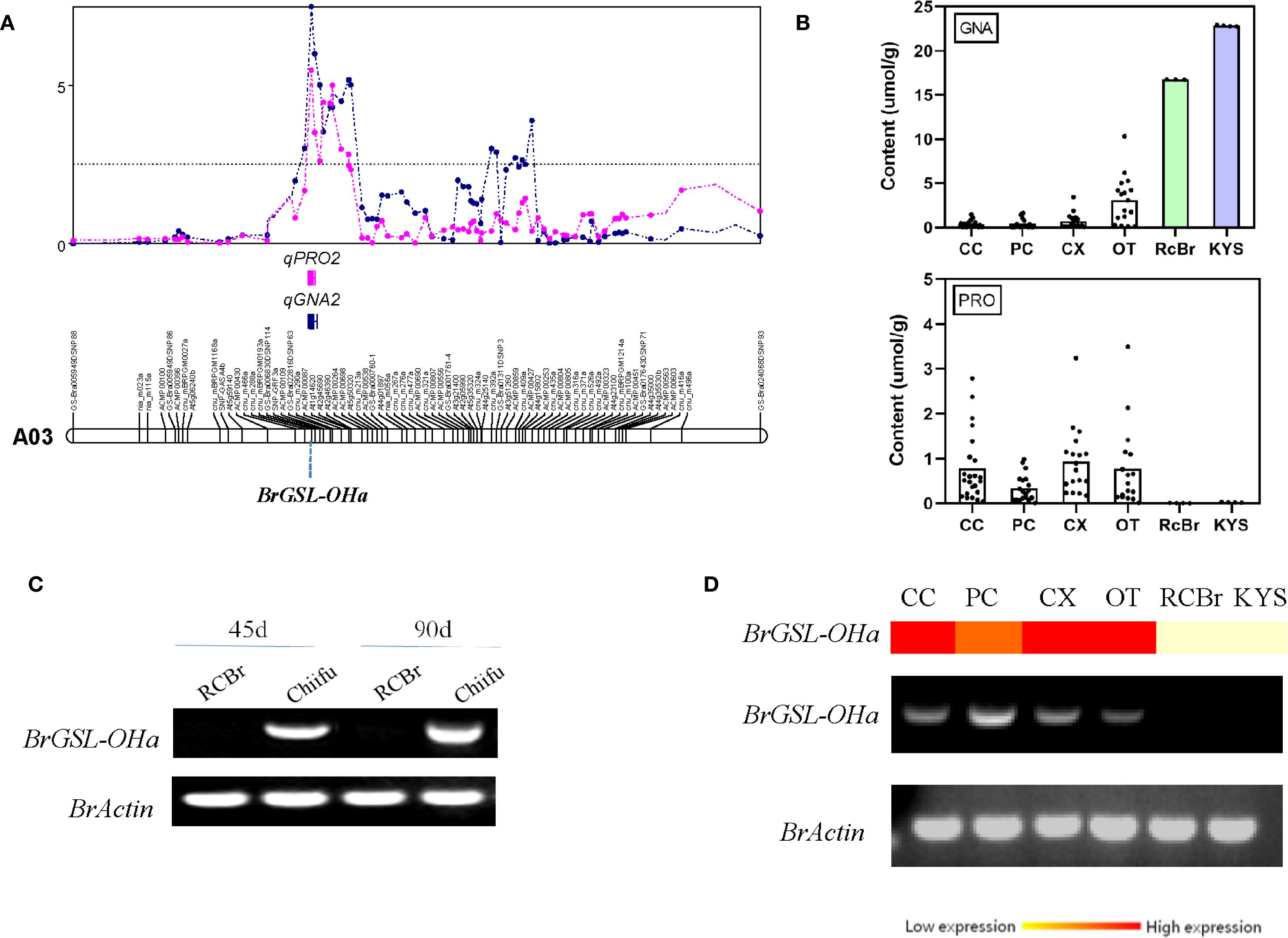 Figure 2. Quantitative trait locus (QTL) mapping for progoitrin and the expression of the candidate gene BrGSL-OHa. (A) QTL positions for progoitrin and gluconapin on chromosome A03. (B) Distribution of gluconapin (GNA) and progoitrin (PRO) contents among different types of Brassica rapa. CC, Chinese cabbage; PC, Pakchoi; CX, Caixin; OT, Oil-type. Rapid-cycling B. rapa (RCBr) and ‘KYS’ are two oil-type B. rapa varieties showing extremely high GNA content and low PRO content. (C) Semi-quantitative real-time polymerase chain reaction (RT-PCR) analysis of the candidate gene BrGSL-OHa using 46-day-old and 90-day-old fresh leaves of ‘Chiifu’ and RCBr. The B. rapa actin gene was used as a control for RNA quantification. (D) Real-time and semi-quantitative PCR analysis of BrGSL-OHa among lines representing different types of B. rapa.