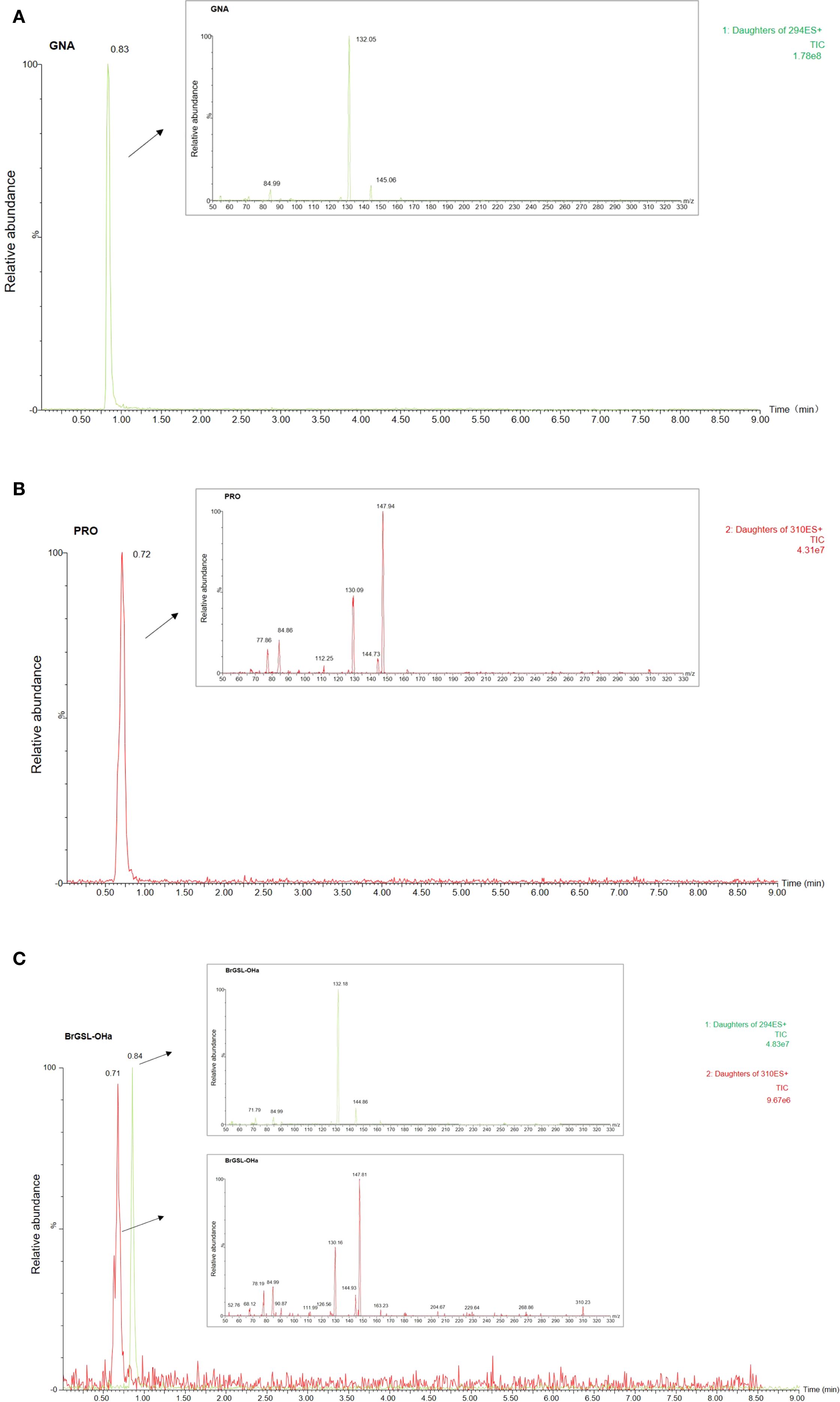 Figure 3. Enzymatic activity of BrGSL-OHa heterologously expressed in Escherichia coli. Total ion chromatography (TIC) and product ion spectrum scanning image of (A) desulfated gluconapin (GNA) standard, (B) desulfated progoitrin (PRO) standard, and (C) desulfoglucosinolates from a sample of GNA treated with heterologously expressed BrGSL-OHa fusion protein. The x-axis of the TIC image represents the retention time and the y-axis represents the relative abundance of ions. The mother ions of GNA (294) and PRO (310) are labeled on the right side of the TIC image. Arrows indicate the product ion spectrum scanning results for the targeted peak in the TIC image.
