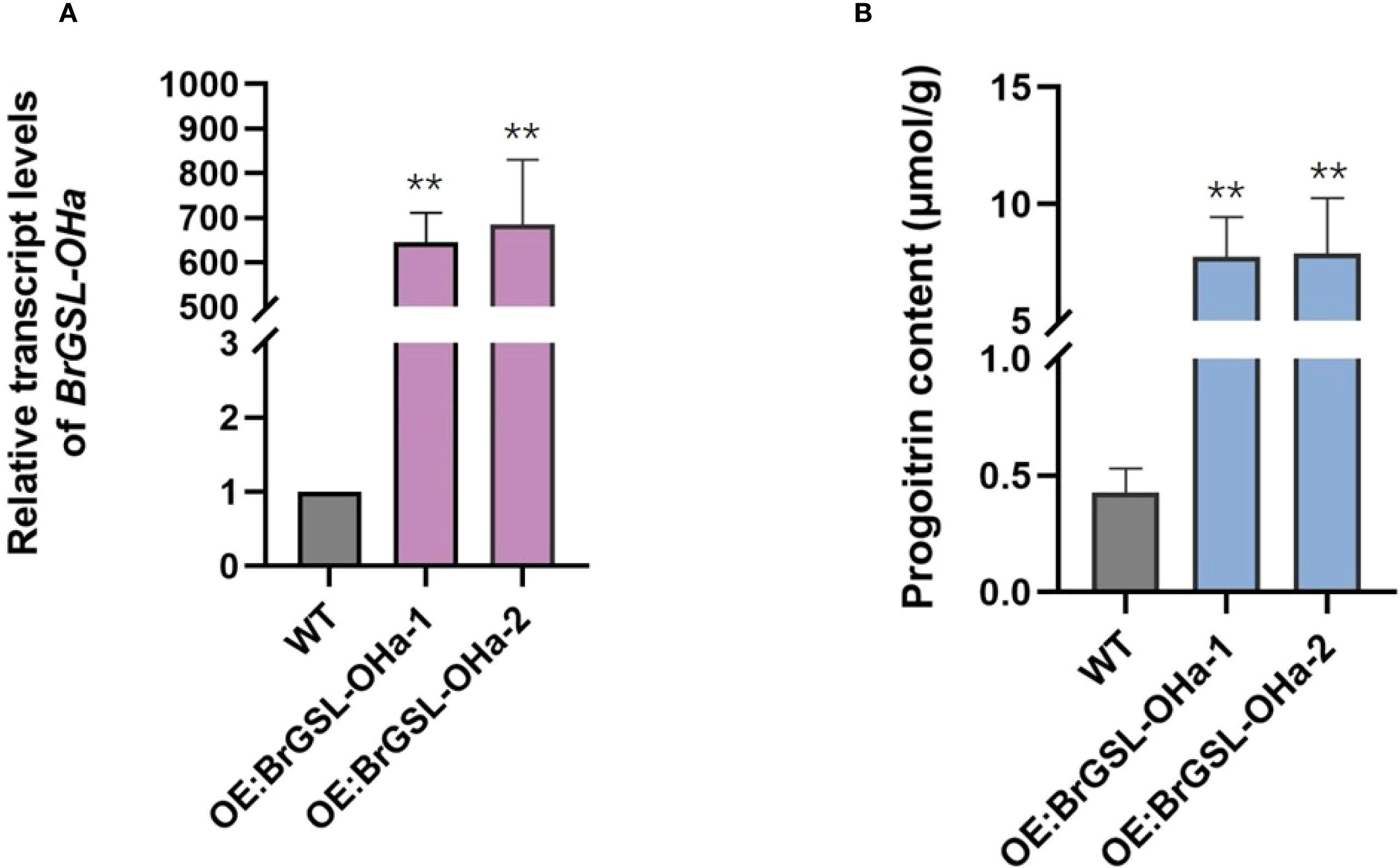Figure 4. BrGSL-OHa confers progoitrin biosynthesis in Brassica rapa. Relative BrGSL-OHa expression levels (A) and progoitrin content (B) in leaves from overexpression transgenic plants (OE) and wild-type Chinese cabbage C-24 (WT) The data are presented as means ± SE from three independent biological replications. Black asterisks (**) indicate a significant difference (t-test, p < 0.01).
