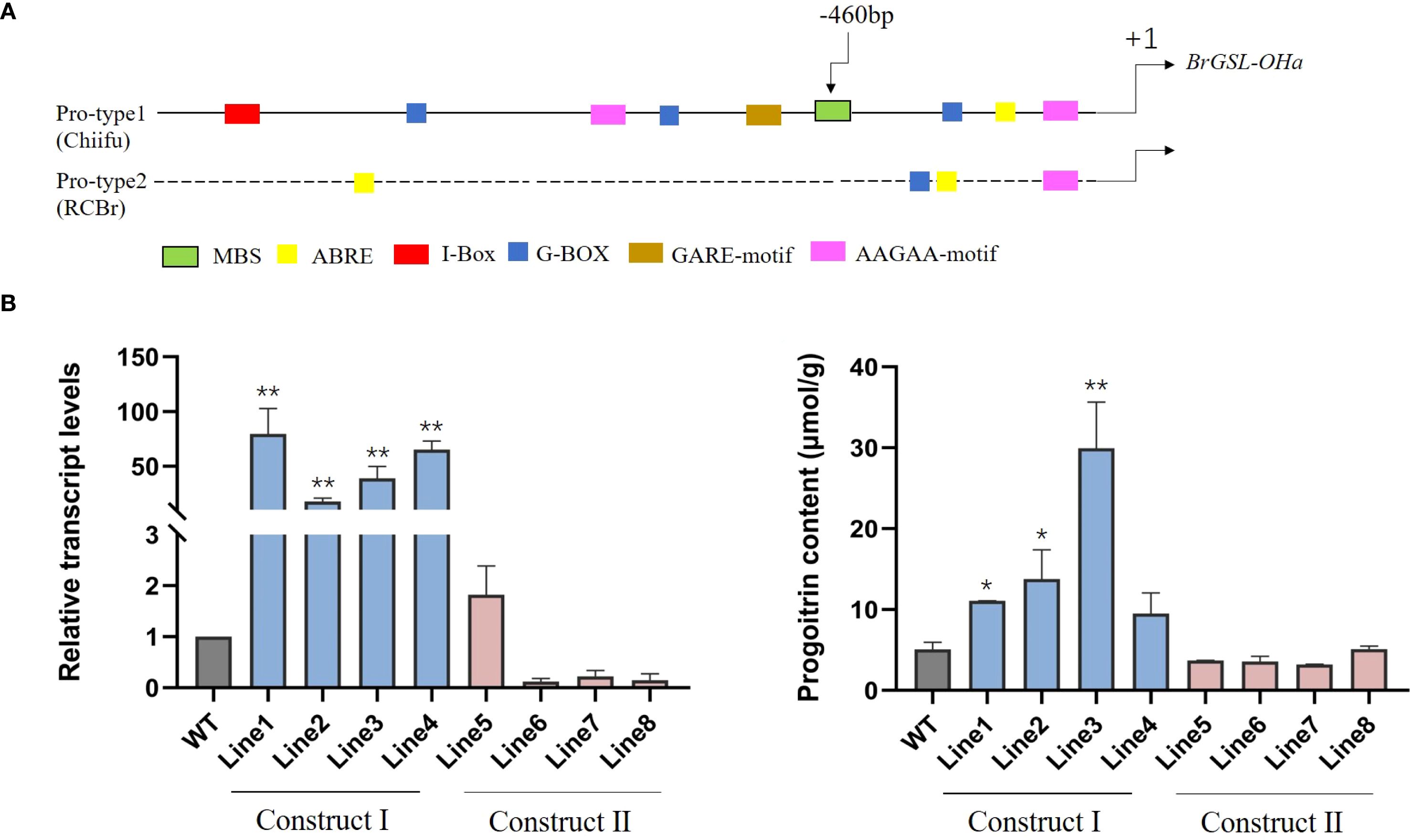 Figure 5. (A) Promoter sequence variation of BrGSL-OHa among Brassica rapa was comprised of two types: Pro-type1 was found in vegetable-type B. rapa and most oil-type B. rapa, as in ‘Chiifu’; and Pro-type 2 occurred in oil-type rapid-cycling B. rapa (RCBr). Predicted cis-elements are represented by colorful boxes. Relative transcript levels (B) and progoitrin content (C) in transgenic plants expressing construct I (Lines 1–4) and Construct II (Lines 5–8) compared with the wild-type Westar genotype (WT) The data are presented as means ± SE from three independent biological replications. Black asterisks (**) indicate a significant difference (t-test, p < 0.01), Black asterisks (*) indicate a significant difference (t-test, p < 0.05).