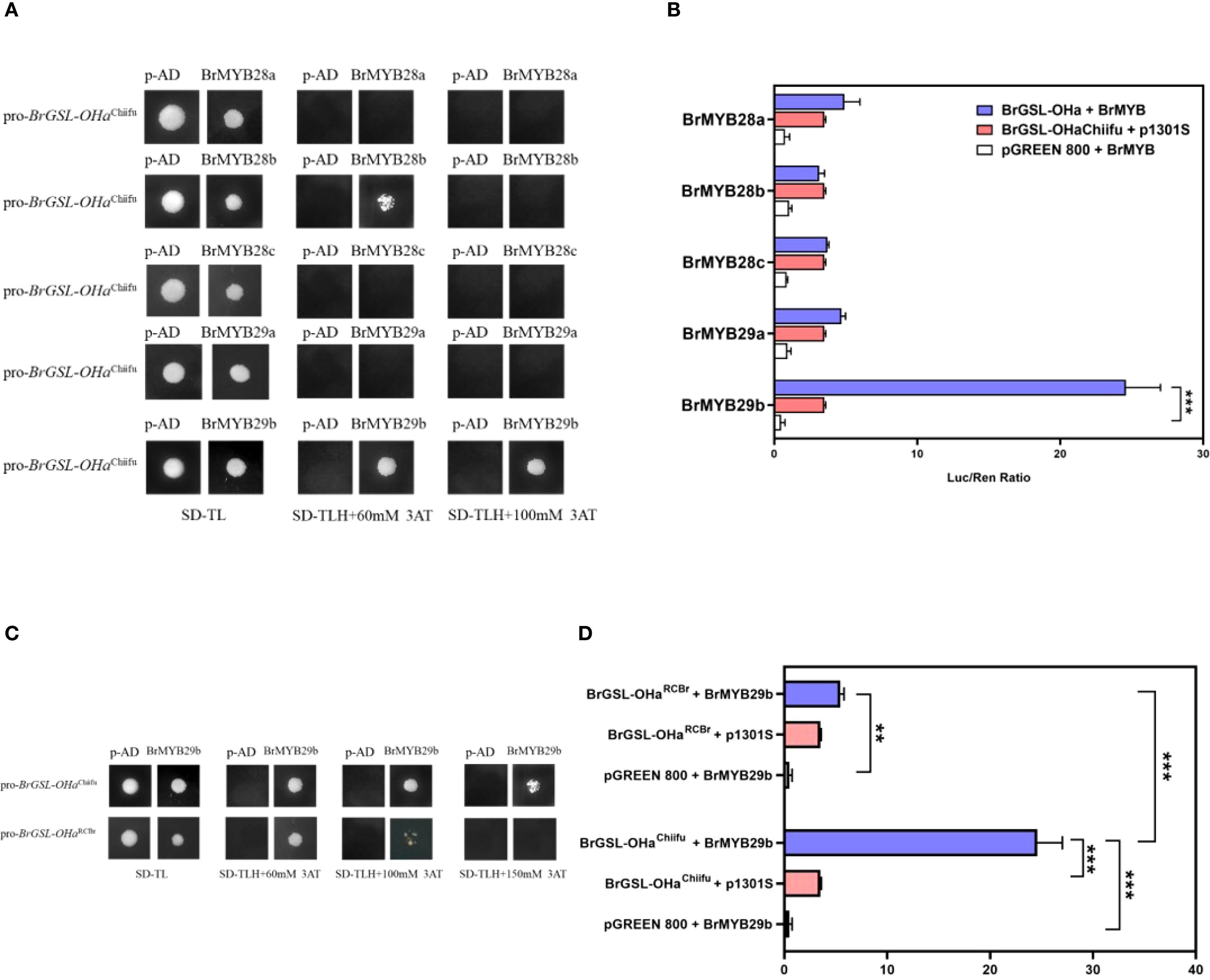 Figure 6. Identification of BrMYB29b as a transcription factor target of BrGSL-OHa. (A) Yeast-one hybrid (Y1H) assay of BrMYB29b binding to BrGSL-OHaChiifu promoter fragments among five MYB candidate genes related to glucosinolate (GSL) synthesis. (B) Dual luciferase system (LUC) detection of five MYB candidate genes binding to BrGSL-OHaChiifu promoter. The data are presented as means ± SE from three independent technical replications. Black asterisks (***) indicate a significant difference (t-test, p < 0.01), Black asterisks (**) indicate a significant difference (t-test, p < 0.05). (C) Y1H assay between BrMYB29b with BrGSL-OHaChiifu and BrGSL-OHaRCBr promoter fragments. (D) Binding of BrMYB29b with the BrGSL-OHaChiifu and BrGSL-OHaRCBr promoters according to the LUC assay results.