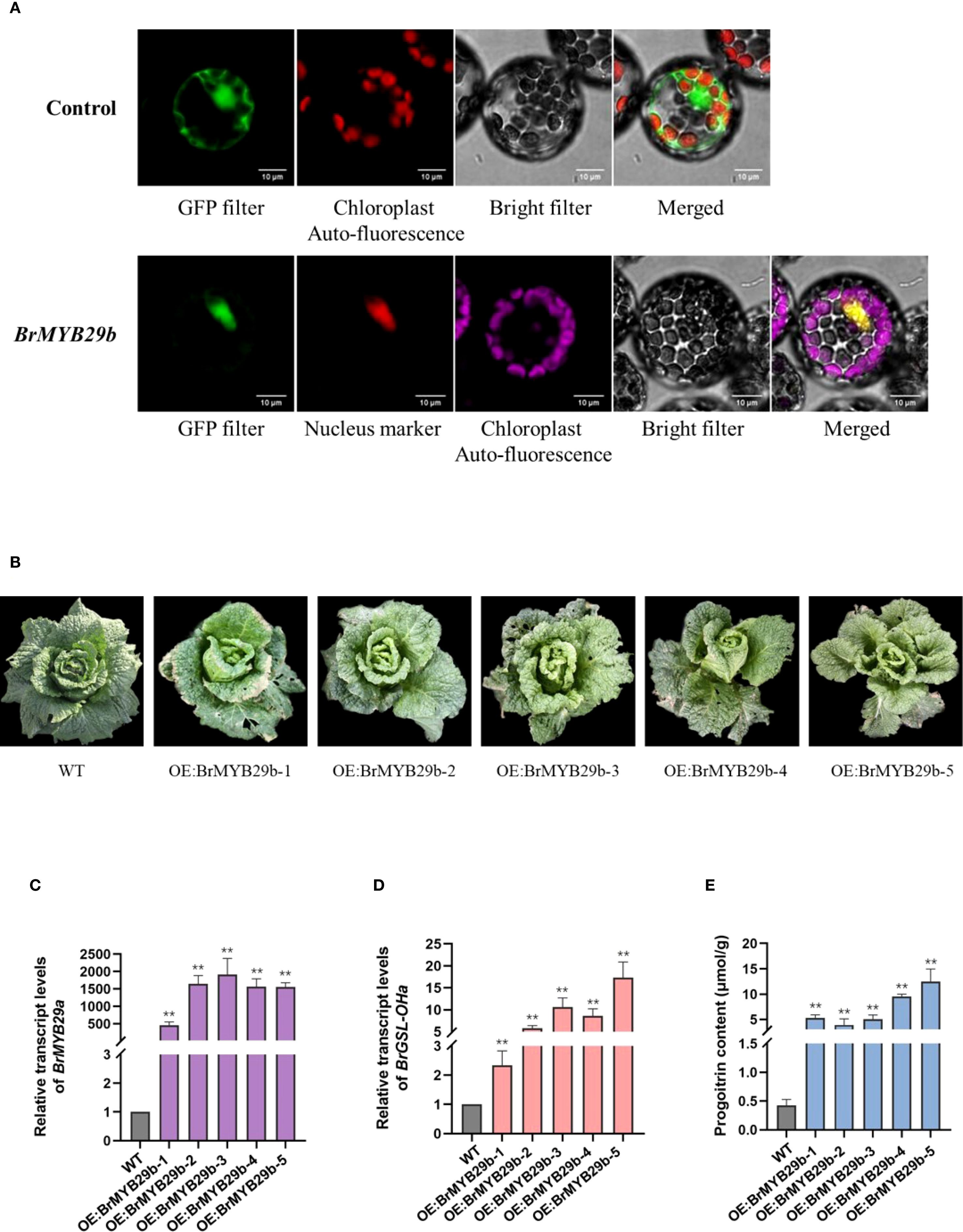 Figure 7. (A) Subcellular colocalization of transiently expressed BrMYB29b-GFP fusion protein with a nucleus marker (nls) in Nicotiana benthamiana leaves. (B) Phenotypes of the wild-type C-24 (WT) and BrMYB29b-overexpressing transgenic T2 plants. Relative transcript levels of BrMYB29b (C), BrGSL-OHa (D), and progoitrin content (E) in wild-type and BrMYB29b-overexpressing transgenic plants. The data are presented as means ± SE from three independent biological replications. Black asterisks (**) indicate a significant difference (t-test, p < 0.01).