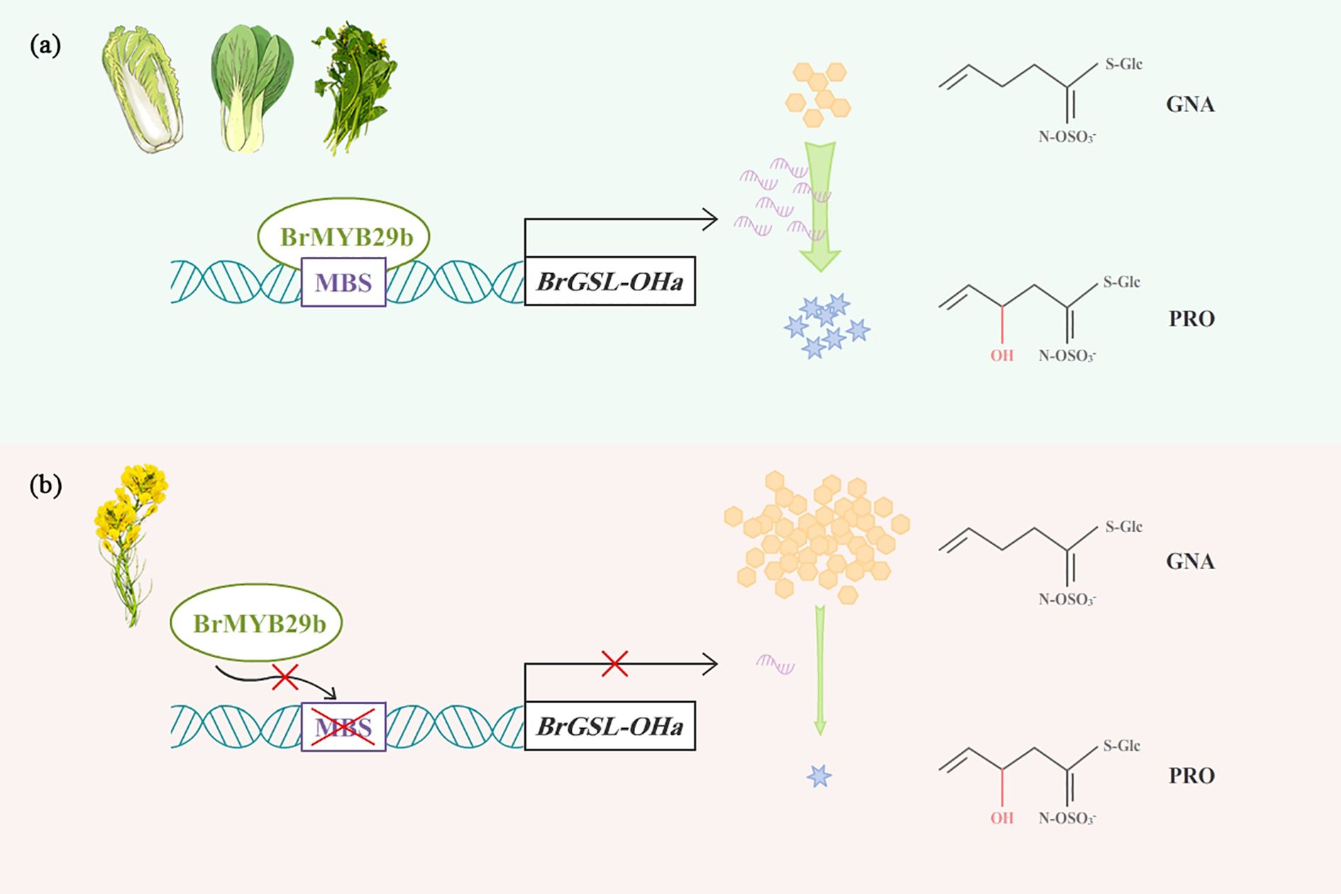 Figure 8. A proposed model for BrMYB29b binding to BrGSL-OHa promoter to regulate PRO biosynthesis in B. rapa. (A) In vegetable and most oil type B. rapa, BrMYB29b interacted with BrGSL-OHa promoter and leads to high expression of BrGSL-OHa that promotes PRO synthesis. (B) In two oil-type B. rapa, RCBr and KYS, lack of MBS in BrGSL-OHa promoter affects the binding ability with BrMYB29b, thus inhibiting BrGSL-OHa expression and PRO conversion from GNA.