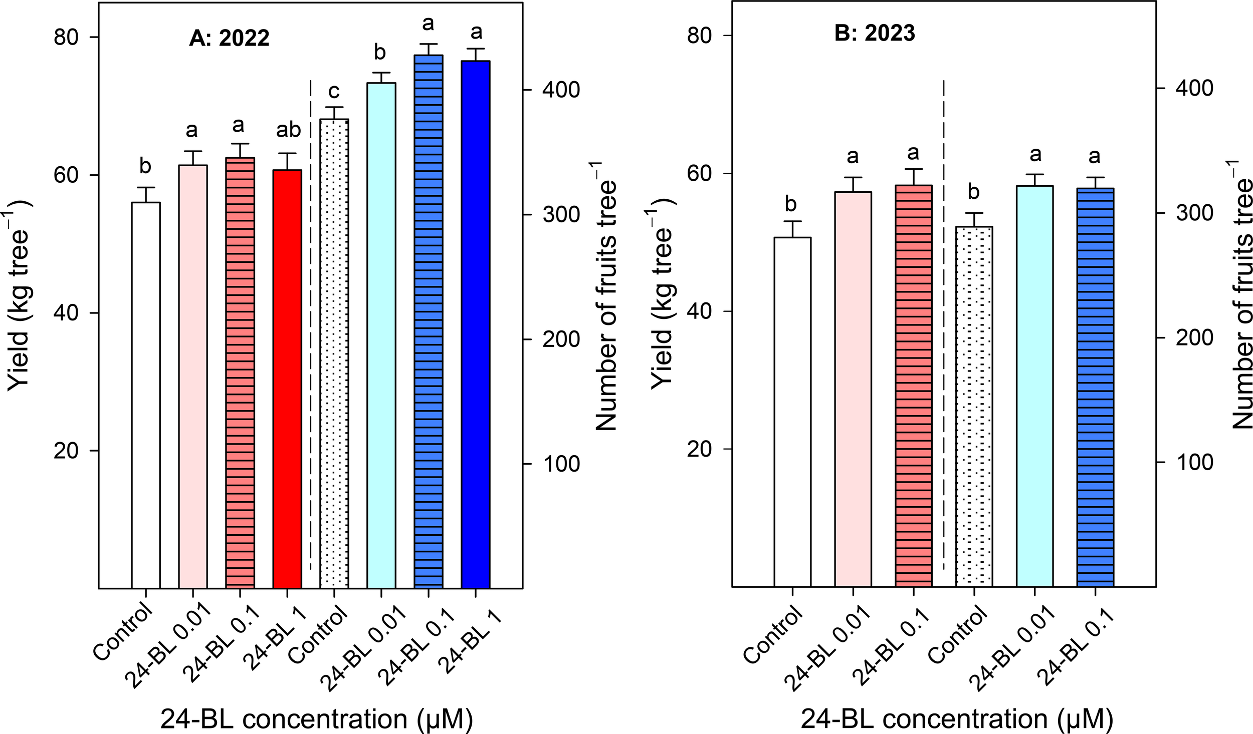 Blood orange yield (kg/tree, left axis; number of fruits/tree, right axis) in two different seasons, 2022 (A) and 2023 (B), as affected by 24-epibrassinolide (24-BL) treatments at 0.01, 0.1, and 1 μM. Data are presented as the mean ± SD. Different letters show significant differences (p < 0.05) among treatments for each growing season.