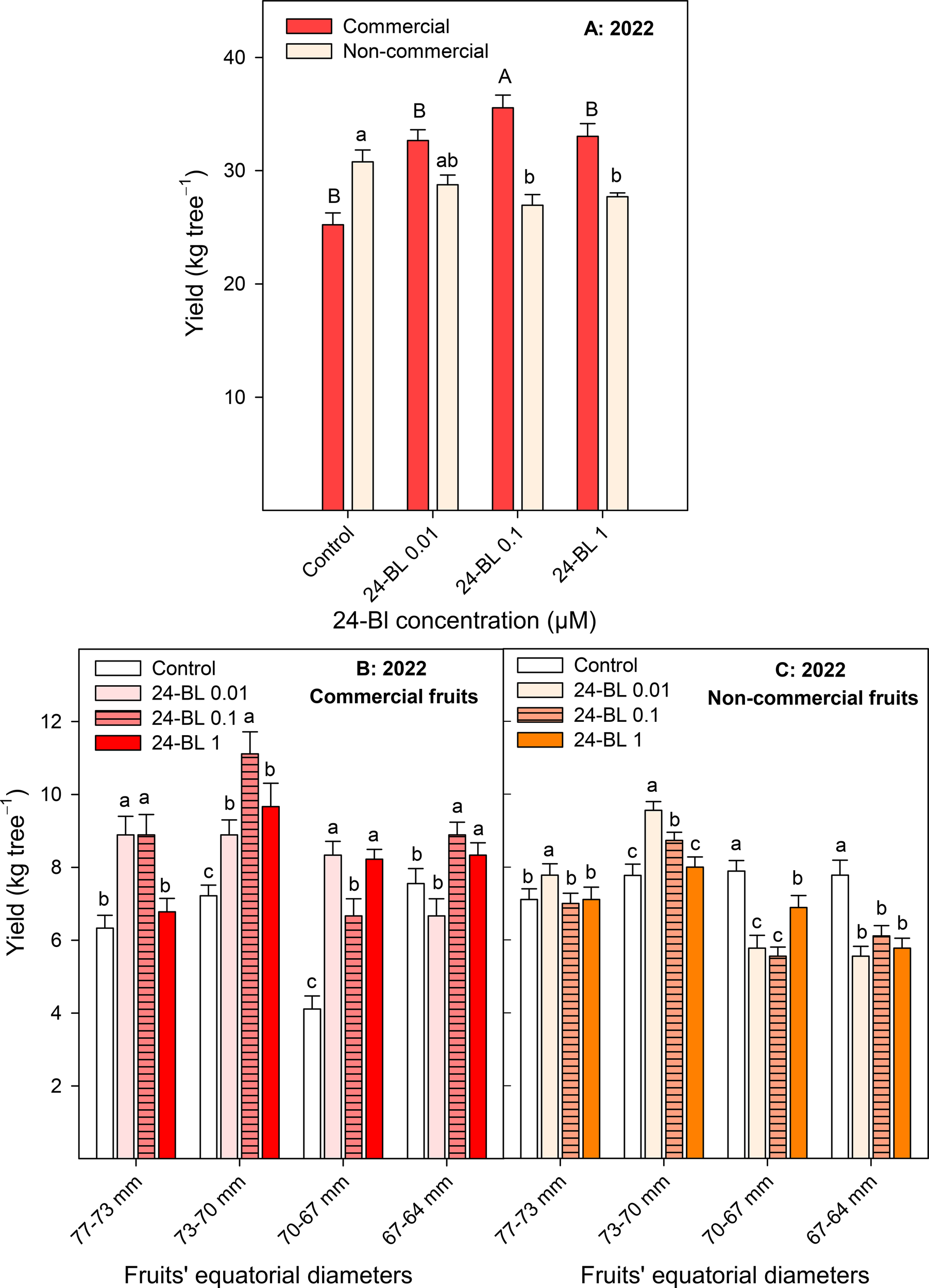Effect of 24-epibrassinolide (24-BL) treatments, at 0.01, 0.1, and 1 μM, on total yield of commercial and non-commercial fruits (A) and distribution of commercial (B) and non-commercial (C) fruit yield on different categories depending on fruits’ equatorial diameters. Data are presented as the mean ± SD. Different capital and lowercase letters in panel A show significant differences (p < 0.05) among treatments for commercial and non-commercial fruits, respectively. Different lowercase letters in panels B and C show significant differences (p < 0.05) among treatments for each fruit category.