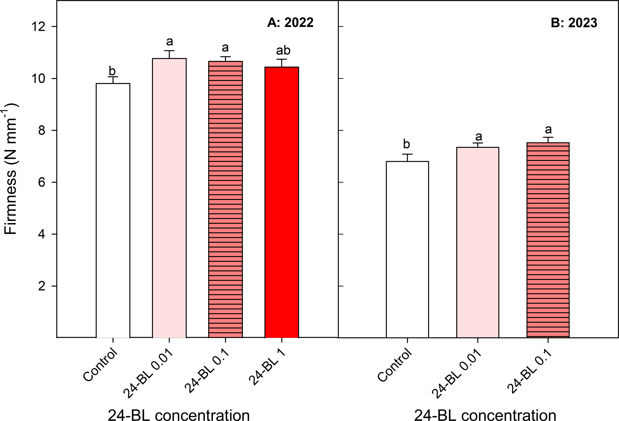Blood orange fruit firmness (N/mm) in two different seasons, 2022 (A) and 2023 (B), as affected by 24-epibrassinolide (24-BL) treatments at 0.01, 0.1, and 1 μM. Data are presented as the mean ± SD. Different letters show significant differences (p < 0.05) among treatments for each growing season.