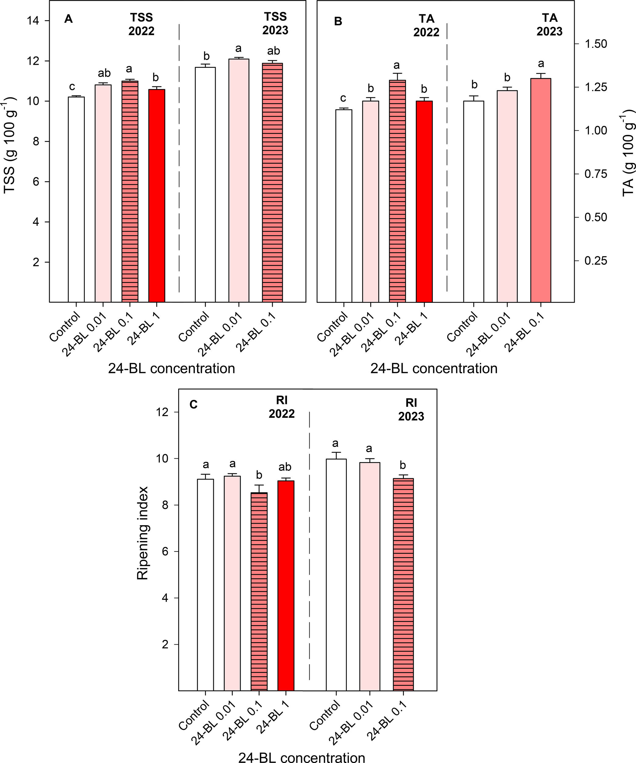 Total soluble solids (TSS); (A) titratable acidity (TA; B), and ripening index (RI; C) in blood orange fruit as affected by 24-epibrassinolide (24-BL) treatments at 0.01, 0.1, and 1 μM. Data are presented as the mean ± SD. Different letters show significant differences (p < 0.05) among treatments for each year.