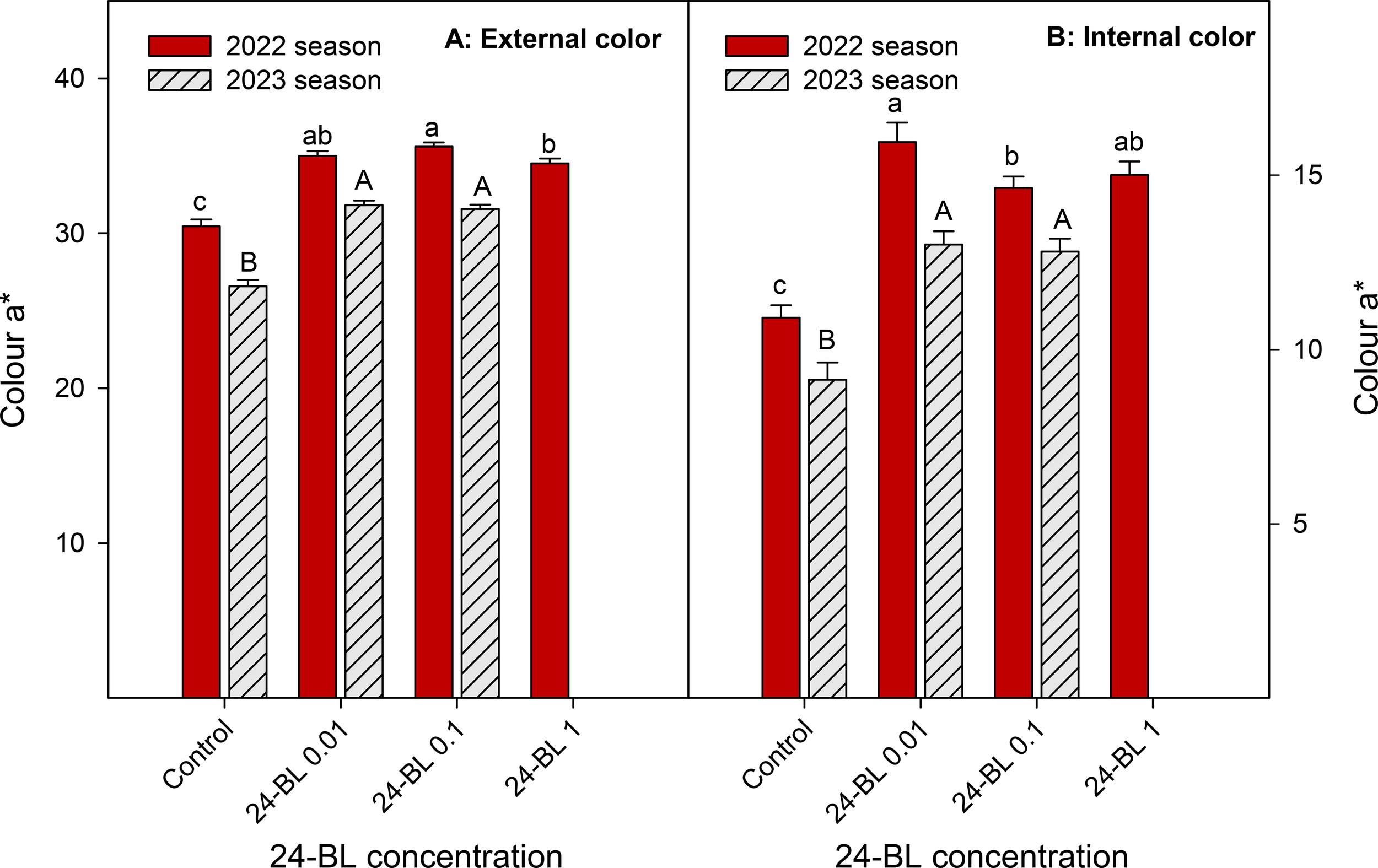 External (A) and internal (B) colour (a* coordinate) in blood orange fruit in 2022 and 2023 seasons as affected by 24-epibrassinolide (24-BL) treatments at 0.01, 0.1, and 1 μM. Data are presented as the mean ± SD. Different lowercase and capital letters show significant differences (p < 0.05) among treatments in 2022 and 2023 seasons, respectively.