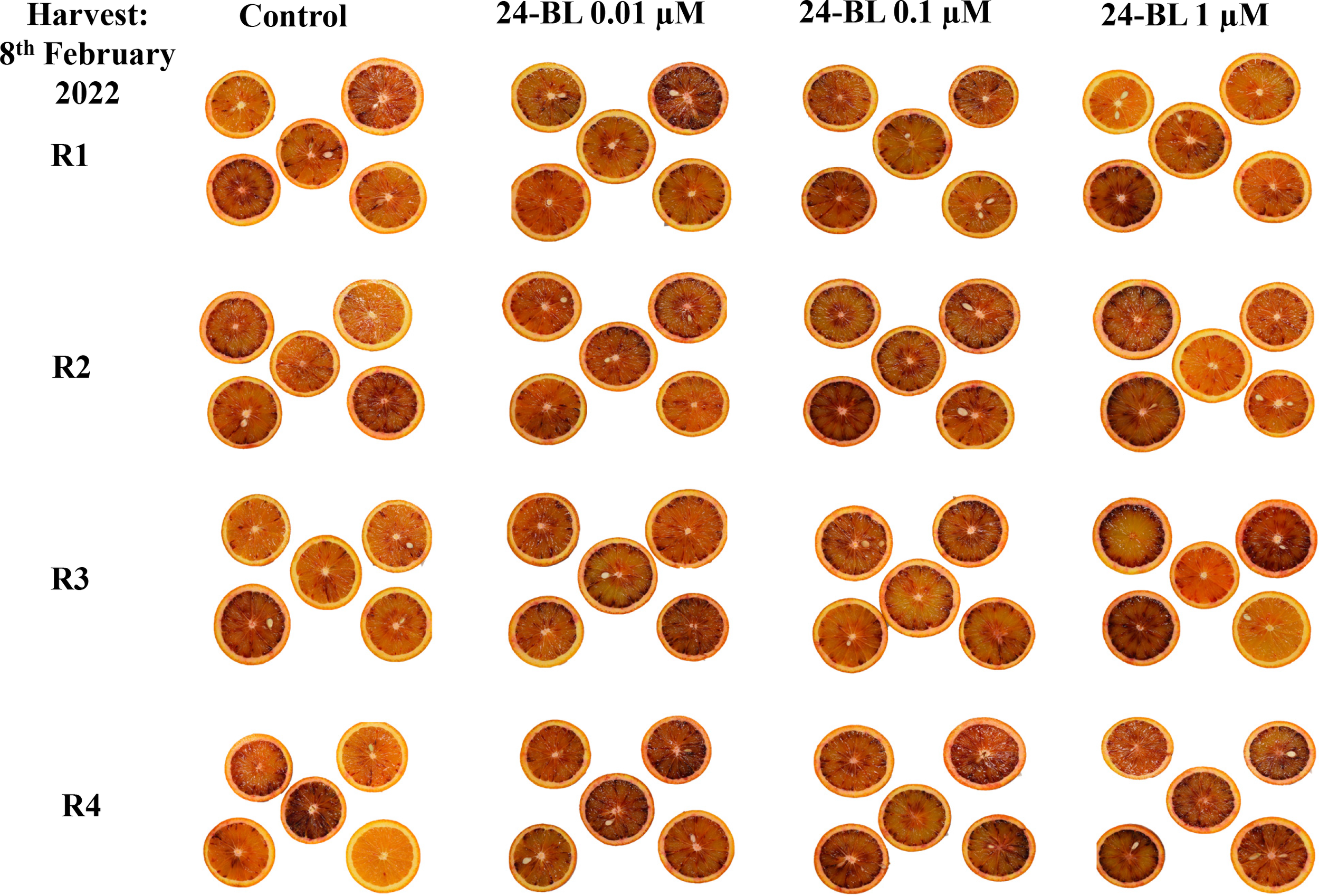 Internal fruit appearance of orange fruits at harvest in 2022 experiment as affected by 24-epibrassinolide (24-BL) treatments at 0.01, 0.1, and 1 μM. R1–R4 mean four replicates of five fruits.