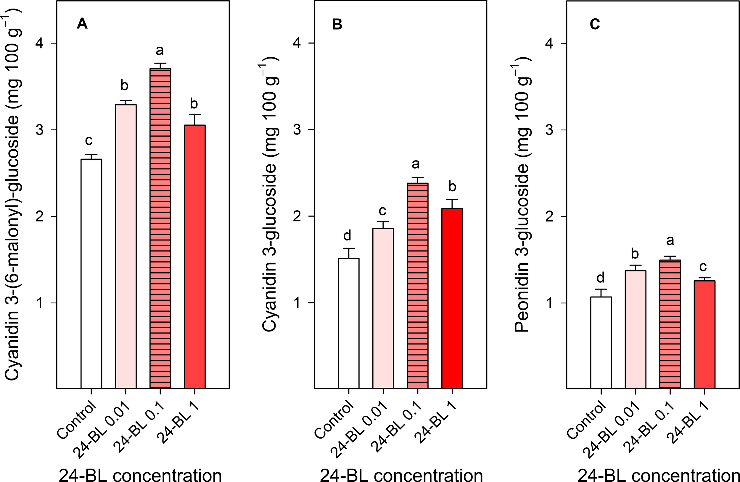 Cyanidin 3-(6-malonyl)-glucoside (A), cyanidin 3-glucoside (B) and peonidin 3-glucoside (C) concentrations in 2022 in blood orange as affected by 24-epibrassinolide (24-BL) treatment at 0.01, 0.1 and 1 μM. Data are presented as the mean ±SD. Diferent letters show significant differences (p < 0.05) among treatments.