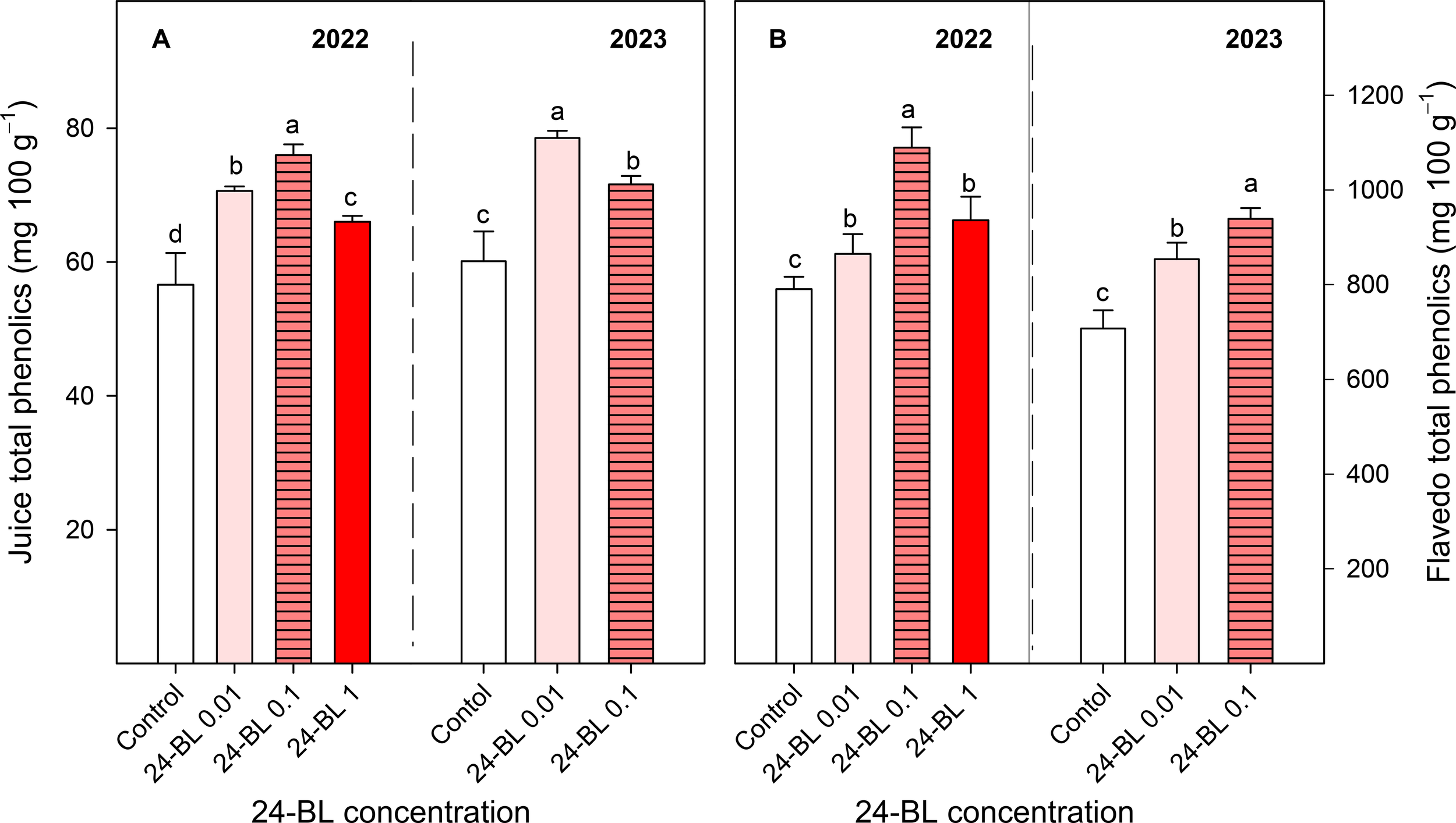 Juice (A) and flavedo (B) total phenolic content in two different seasons, 2022 and 2023, in blood orange fruit as affected by 24-epibrassinolide (24-BL) treatments at 0.01, 0.1, and 1 μM. Data are presented as the mean ± SD. Different letters show significant differences (p < 0.05) among treatments for each year.
