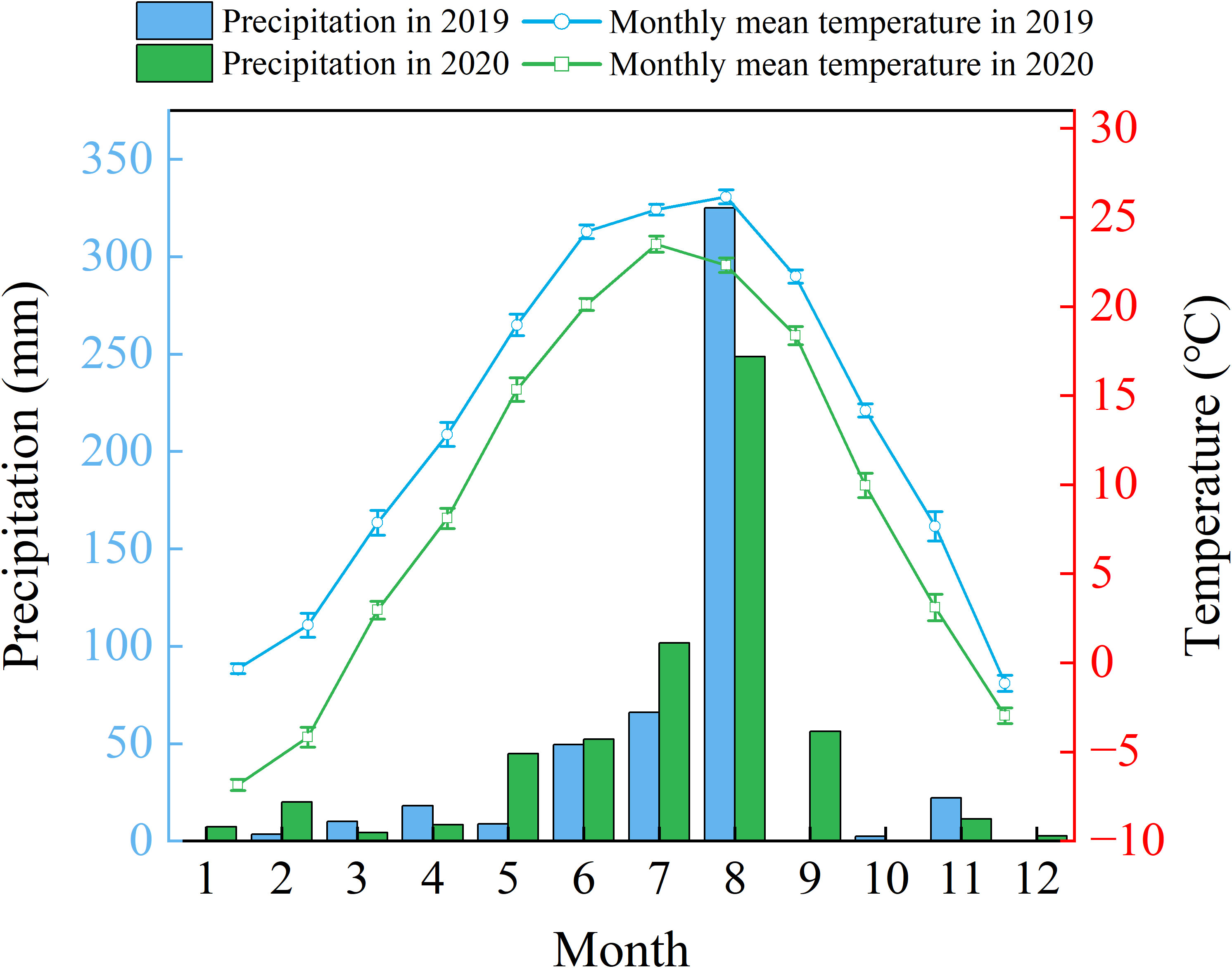 In this study, the plant material consisted of two-year-old bare-root seedlings of the tree-type honeysuckle (Lonicera japonica Thunb) 'Beihua No.1', supplied by Jiujianpeng Agricultural Technology Co., Ltd. in Shandong Province, China. Propagated by cuttings, this cultivar reliably expresses key agronomic traits like an extended flowering period and elevated bioactive compound content. Field trials were conducted within a coastal saline-alkali soil demonstration area at the Chinese Academy of Sciences Yellow River Delta Coastal Wetland Ecological Experimental Station (37°45'50"N, 118°59'24"E), with laboratory specimens maintained under controlled conditions. The Yellow River Delta has a warm temperate continental monsoon climate characterized by prevailing, southeasterly and northeasterly winds. Between 1961 to 2020, mean annual precipitation reached 602.98 mm (range: 357.15-1279.24 mm), while regional evaporation averaged about 1962 mm annually (He et al., 2007). Seasonally the dry period predominantly occurs from April to June, with 70% of precipitation is concentrated during July to August (Figure 1).