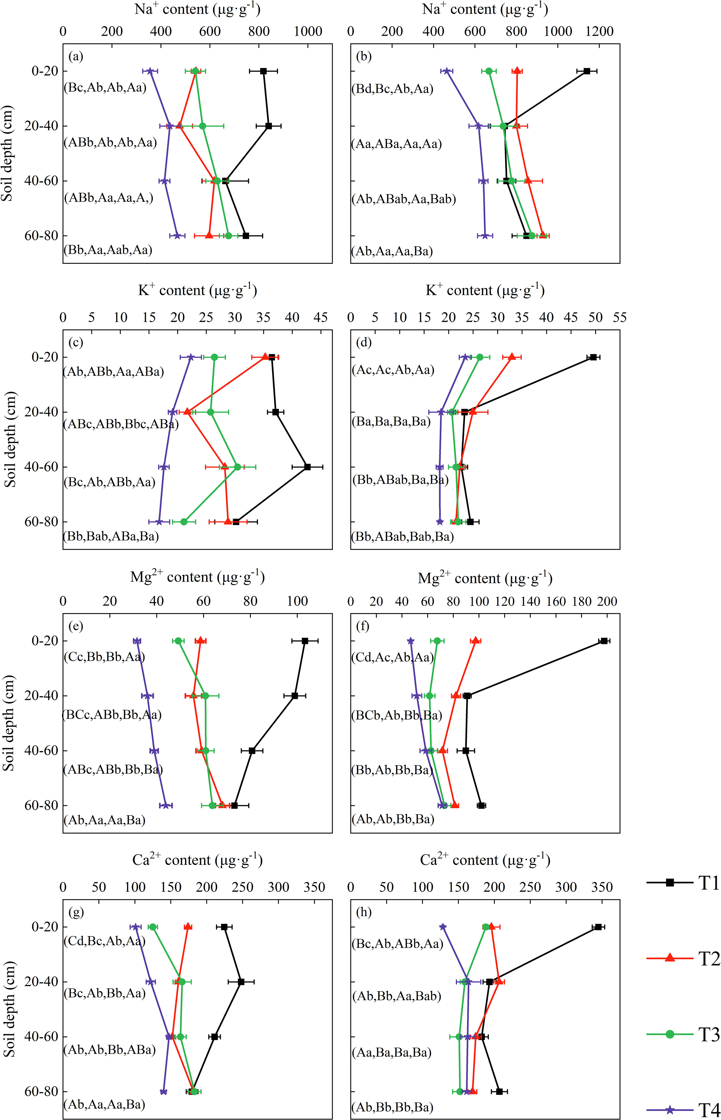 Graphs show soil ion content versus soil depth for Na⁺, K⁺, Mg²⁺, and Ca²⁺ across different treatments (T1 to T4). Each graph, labeled a to h, displays varied content levels and trends at soil depths from 0 to 80 cm. Graphs illustrate differences among treatments, highlighted by letter combinations on each series line, showing significant variations in concentration values.