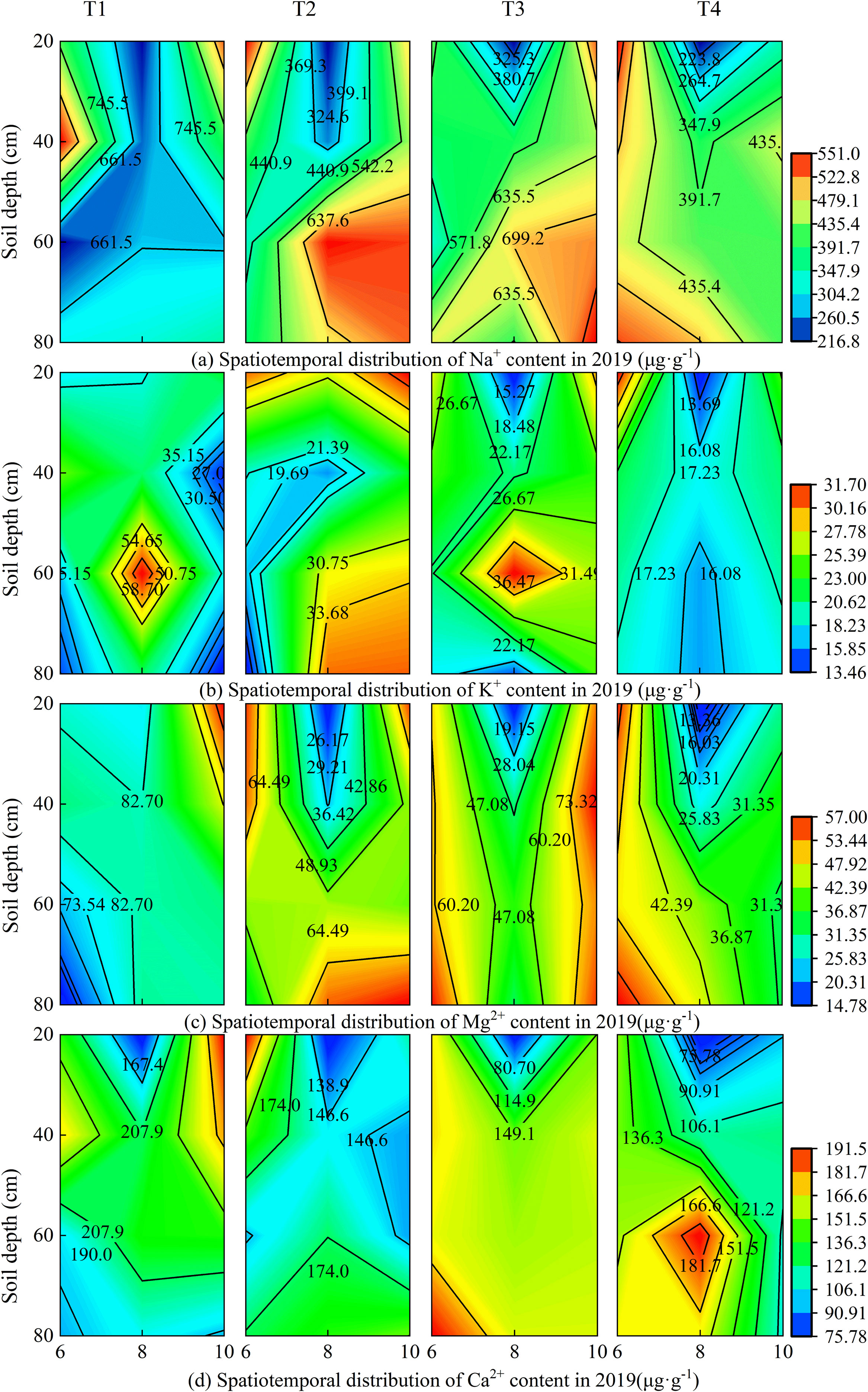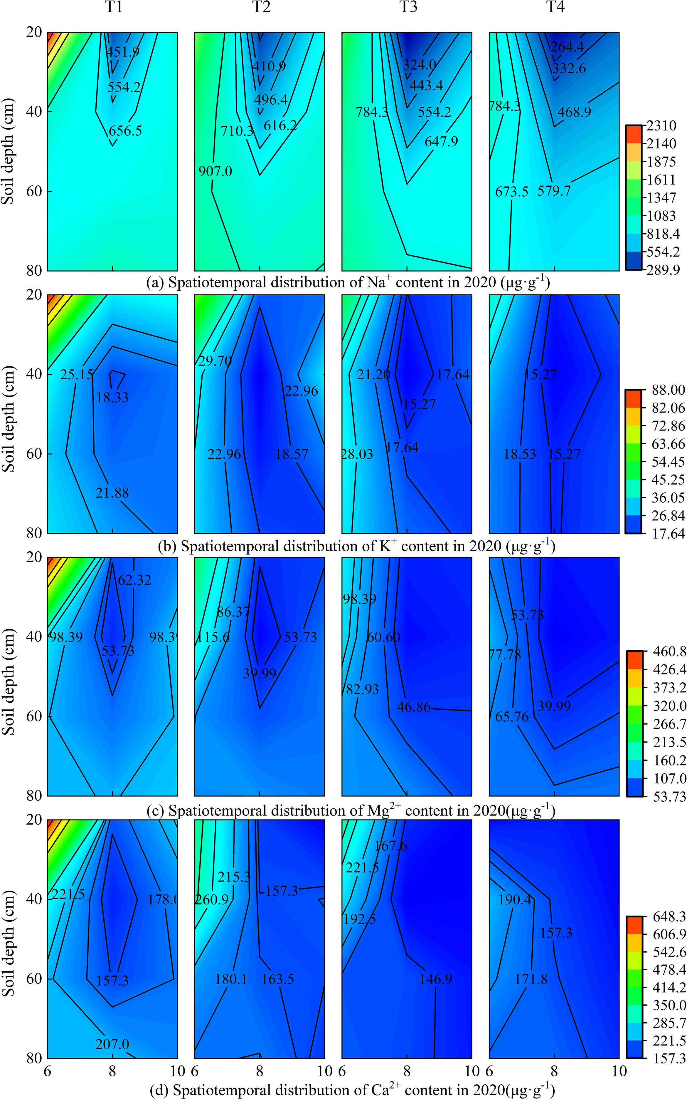 Contour plots showing the spatiotemporal distribution of variousions in soil in 2020 depicted in four panels. Panel (a) shows Na+ distribution, withconcentrations ranging from 289.9 to 2310 micrograms per gram. Panel (b) displays K+ distribution, ranging from 17.64 to 88.00 micrograms per gram. Panel (c) illustrates Mg2+ distribution with a range from 53.73 to 460.8 micrograms per gram, while Panel (d) presents Ca2+ distribution, ranging from 157.3 to 648.3 micrograms per gram. The plots show concentration at different soil depths across three time points T1 to T4.