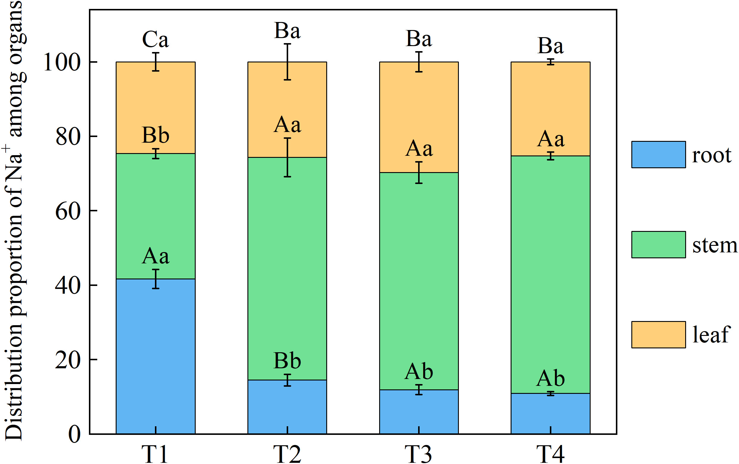 Figure 5. Effects of different brackish water irrigation levels on Na+ distribution in honeysuckle organs (Mean ± SE, n = 4). T1 (control, no irrigation); T2 (40 mm); T3 (80 mm); T4 (120 mm). Uppercase letters indicate significant differences among different organs under the same treatment; lowercase letters denote significant differences among different treatments for the same organ (P< 0.05).