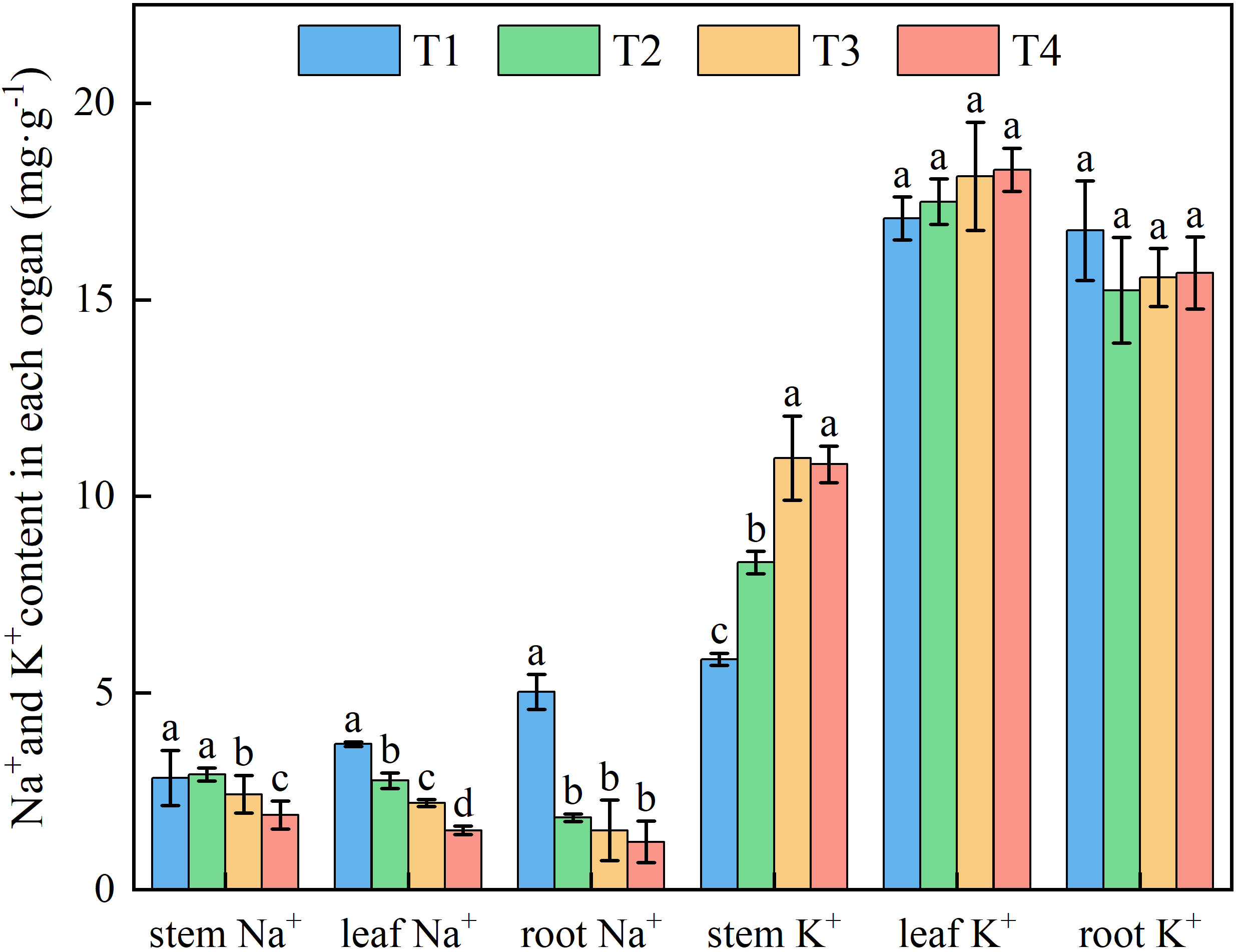 Figure 6. Effects of different brackish water irrigation amounts on Na+ and K+ contents in honeysuckle (Mean ± SE, n = 4). T1 (control, no irrigation); T2 (40 mm); T3 (80 mm); T4 (120 mm). Different letters indicate significant differences between treatments (P < 0.05).