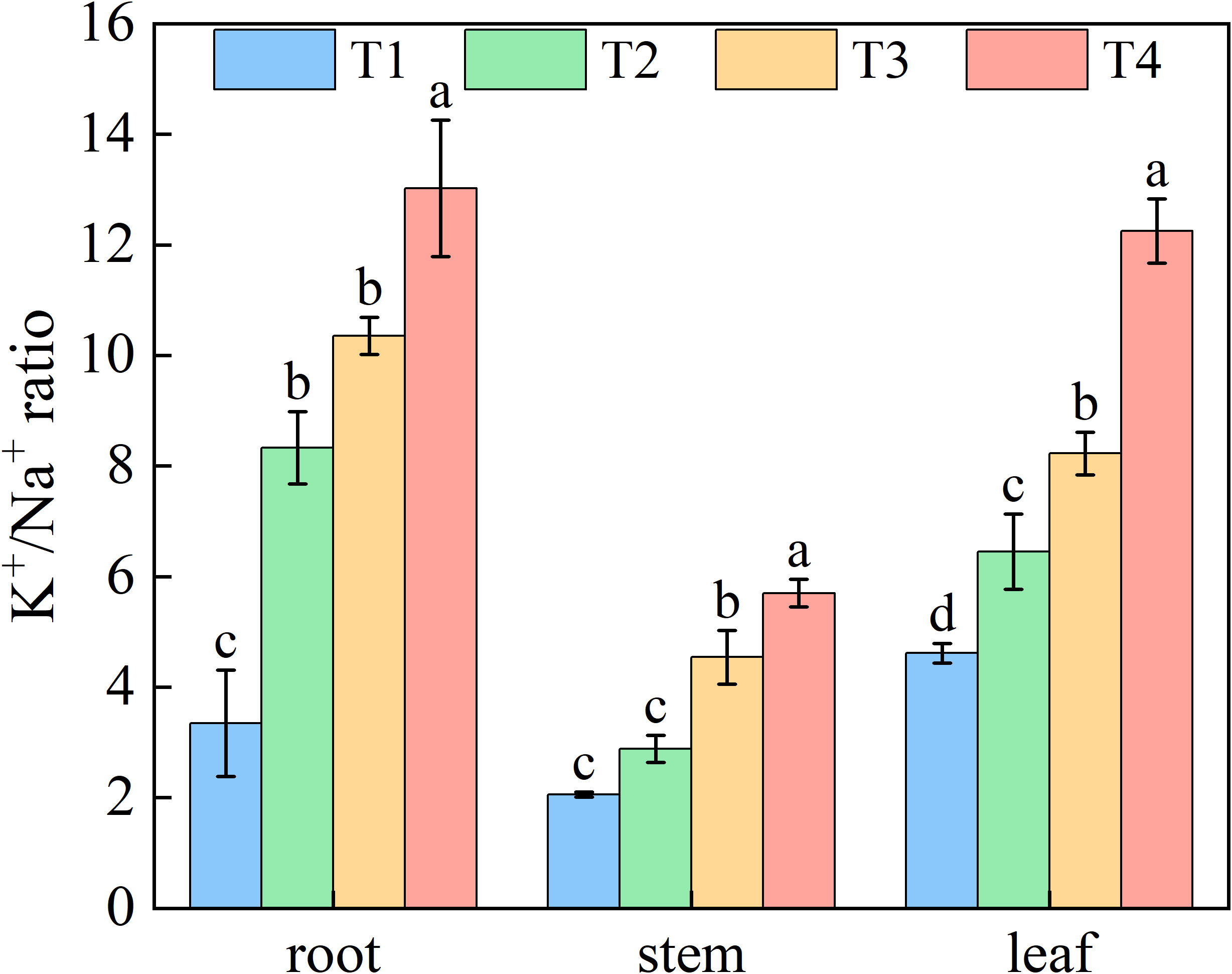 Bar graph depicting the K+/Na+ ratio in root, stem, and leaf for four treatments: T1 (blue), T2 (green), T3 (yellow), T4 (red). Values increase from root to leaf, with T4 consistently highest, followed by T3, T2, and T1. Error bars indicate variability, with different letters representing significant differences.