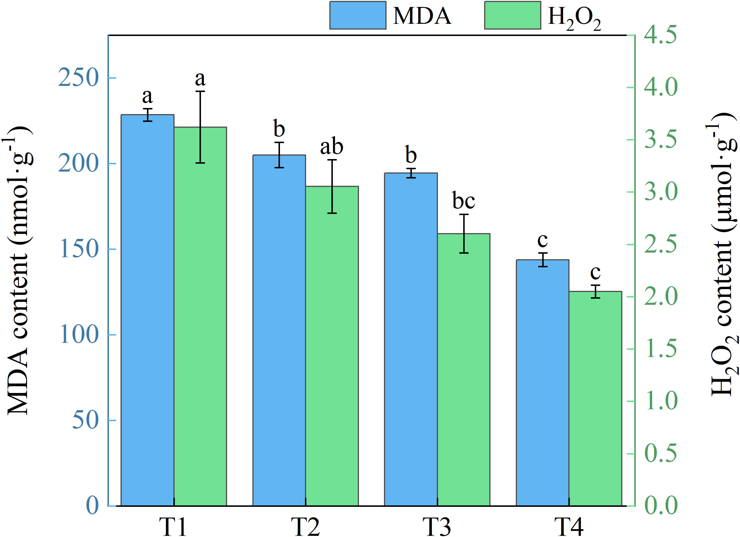 Bar graph comparing MDA content in blue and H₂O₂ content in green across four treatments: T1, T2, T3, and T4. MDA decreases from T1 (highest at 250 nmol·g⁻¹) to T4 (lowest at 150 nmol·g⁻¹). H₂O₂ also declines from T1 (3.5 μmol·g⁻¹) to T4 (2.0 μmol·g⁻¹). Error bars and letters indicate statistical significance.