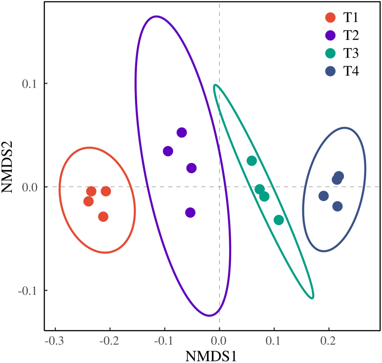 The ordination revealed a clear separation among the four treatments without overlap, indicating distinct differences. T1 and T4 formed tight clusters along the NMDS2 axis, suggesting high within-treatment homogeneity. In contrast, T2 and T3 exhibited a more dispersed distribution, reflecting a certain degree of heterogeneity among their replicates. Notably, T1 and T4 were positioned farthest apart on NMDS1, demonstrating the most pronounced difference. The closer proximity of T2 and T3 on the ordination plot indicates a smaller difference between them (Figure 9).