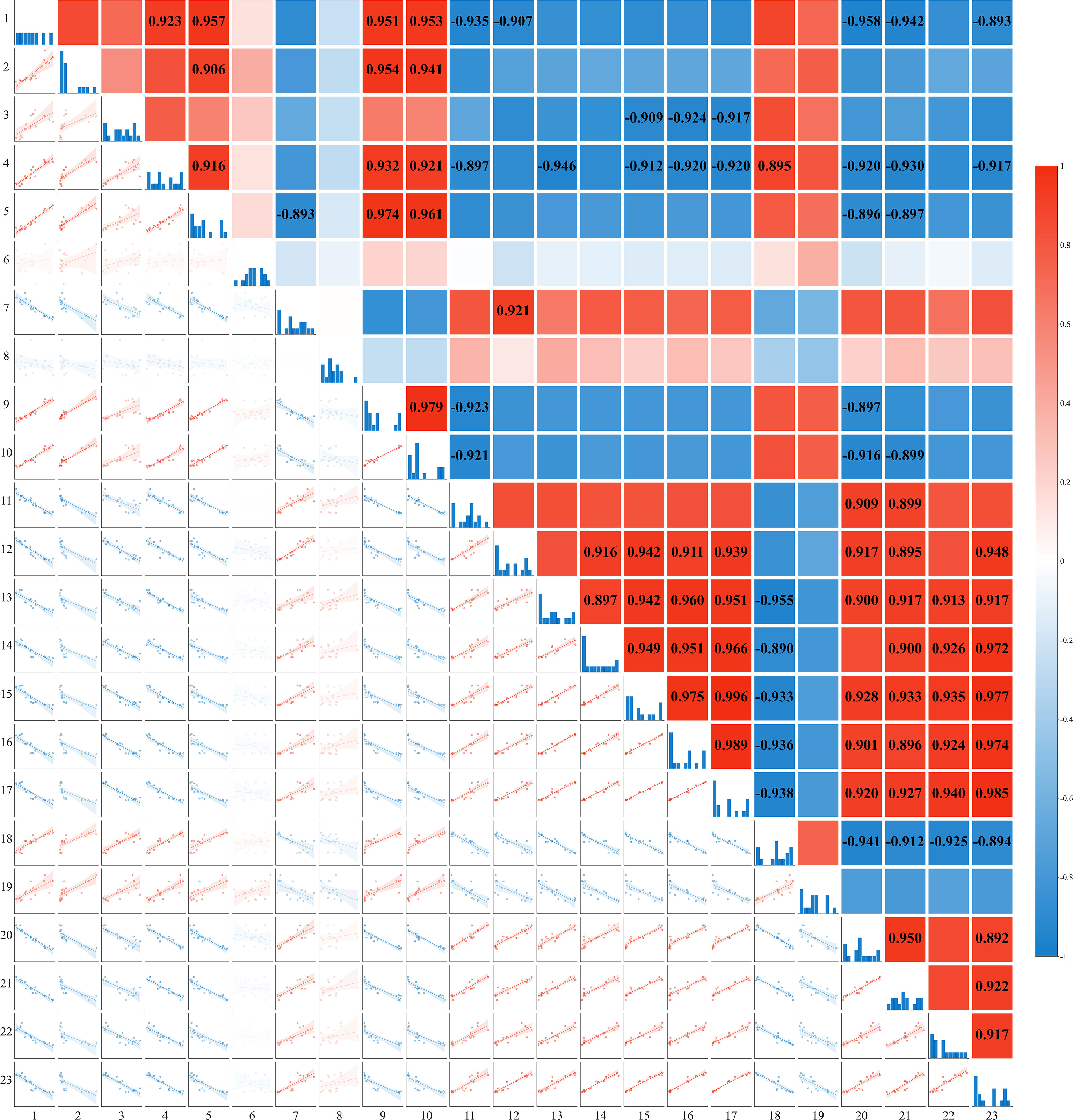 Figure 10. Correlation analysis of soil ion content with growth and physiological indices of honeysuckle under different irrigation levels (Mean ± SE, n = 4). 1: 0-20 cm Na+ content; 2-4: Na+ content in roots, stems, and leaves; 5: 0-20 cm K+ content; 6-8: K+ content in roots, stems, and leaves; 9: 0-20 cm Mg2+ content; 10: 0-20 cm Ca2+ content; 11-13: K+/Na+ ratio in roots, stems, and leaves; 14-17: root, stem, leaf, and total biomass; 18: MDA content; 19: H2O2 content; 20: base diameter; 21: plant height; 22: leaf area index; 23: Na+ accumulation.