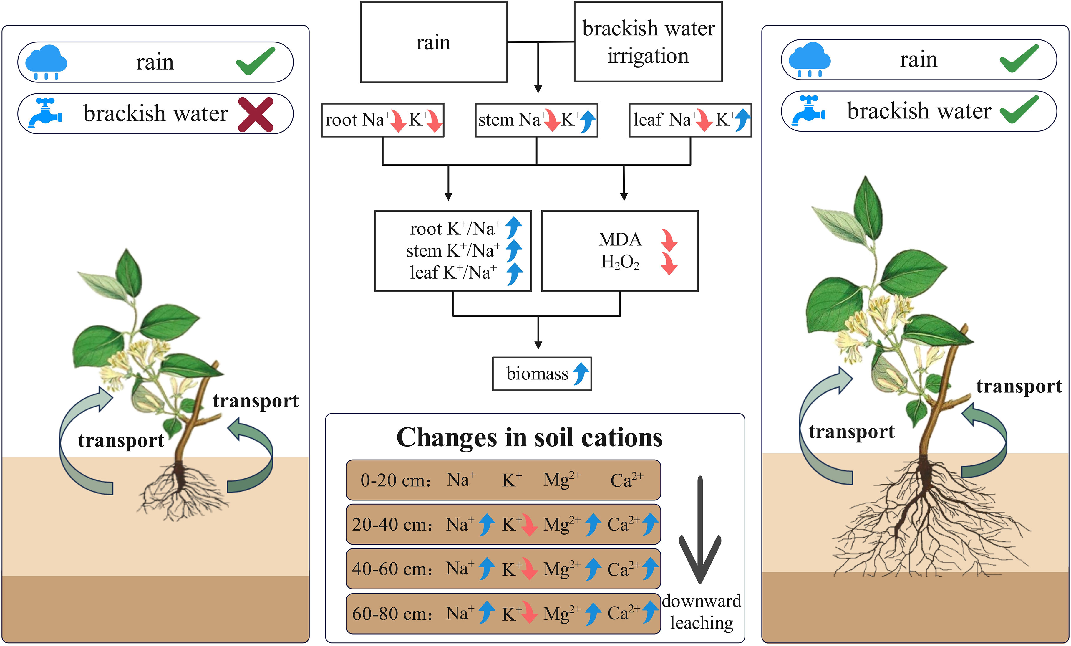 Results: With increasing brackish water irrigation, (1) significantly reduced cation accumulation in the topsoil. Compared to T1, the soil Na+ content under T2, T3, and T4 decreased by 33.69%, 33.94%, and 56.53% in 2019, and by 29.53%, 41.46%, and 59.31% in 2020, respectively. Similarly, the soil K+ content decreased by 3.20%, 27.48%, and 38.78% in 2019, and by 33.58%, 46.77%, and 52.80% in 2020 under the same treatments. (2) In honeysuckle, selective sodium partitioning and potassium homeostasis enhanced the leaf K+/Na+ ratio. The ratio in T4 was 165.45%, 89.90%, and 48.89% higher than in T1, T2, and T3, respectively—a response driven by a 59.27% reduction in leaf Na+ and a 7.24% increase in leaf K+ in T4. (3) alleviated salt-induced oxidative stress in the leaves, reducing the malondialdehyde (MDA) content from 228.46 nmol•g-1 (T1) to 143.81 nmol•g-1 (T4) and decreasing hydrogen peroxide (H2O2) by 43.42%. Concurrently, the whole-plant biomass under T4 (829.56 g) exhibited an 8.8-fold increase versus T1 (94.05 g), while the total Na+ accumulation per plant increased from 351.66 mg (T1) to 1391.97 mg (T4).