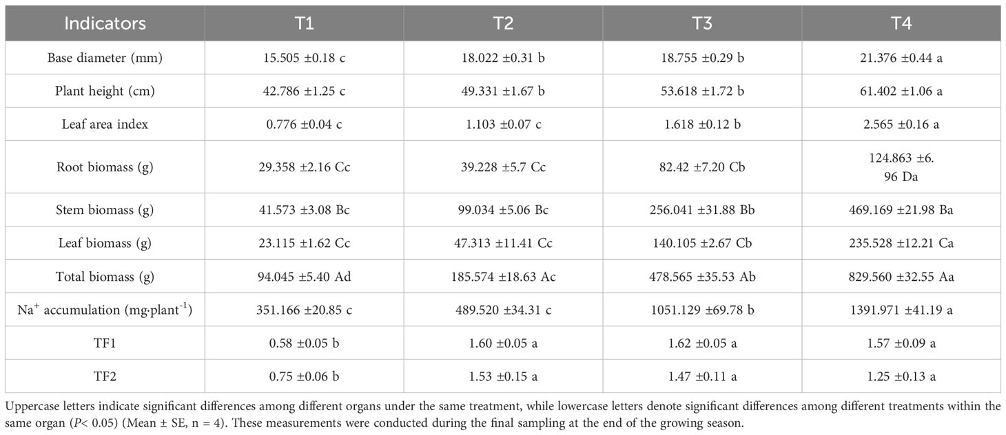 As the irrigation of brackish water irrigation increased, the basal diameter, plant height, and leaf area index of honeysuckle showed significant increases (Supplementary Figure S1), significant differences were observed between treatment T4 and treatments T3, T2, T1. Biomass increased dependently with brackish water irrigation intensity (Table 1). T4 achieved 829.560 g total biomass 8.82, 5.09, and 1.97-fold higher than T1, T2, and T3. Root, stem, and leaf biomass peaked under T4 treatments. Root biomass in these treatments exceeded T1 by 33.62% (T2), 180.74% (T3) and 325.31% (T4). Stem biomass in T2, T3, and T4 increased by 138.22%, 515.88%, and 1028.54%, respectively, compared with T1. T2, T3, and T4 leaf biomass increased by 140.69%, 507.02%, and 918.94%, respectively, compared to T1. T4 was significantly higher than the other three groups, followed by T3 which showed significantly higher values than T1 and T2 but remained significantly lower than T4. No significant difference was observed between T1 and T2, both of which were significantly lower than T3 and T4.
