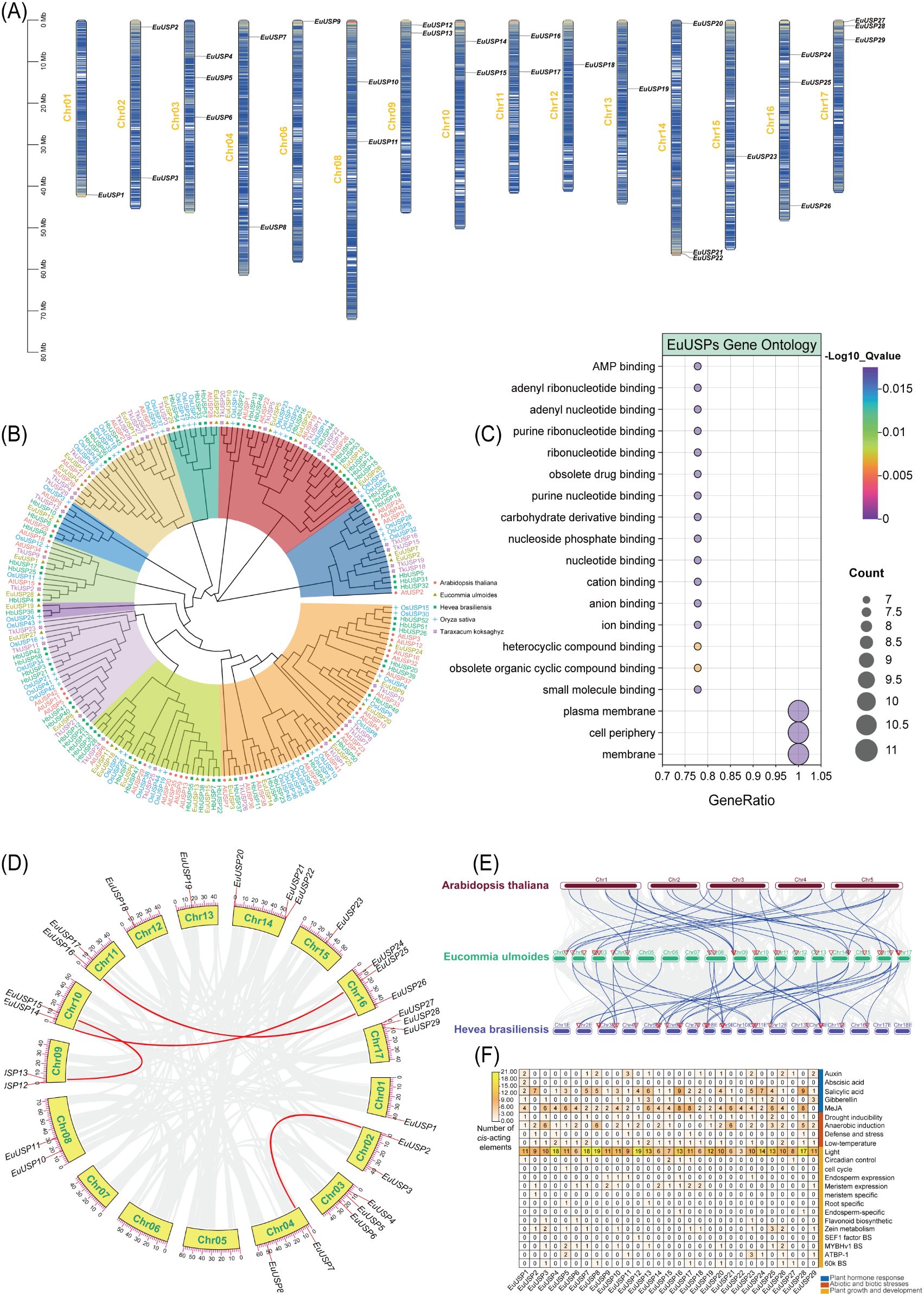 Figure 1. Identification of EuUSPs genes in E.ulmoides. (A) Chromosomal mapping. (B) Phylogenetic relationship among the EuUSPs proteins of the 5 plant species. (C) Gene ontology analysis. (D) Collinearity analysis of EuUSPs gene family in E. ulmoides. (E) Collinearity relation of USP genes in the genomes of A.thaliana and H.brasiliensis. (F) Analysis on cis-acting elements.