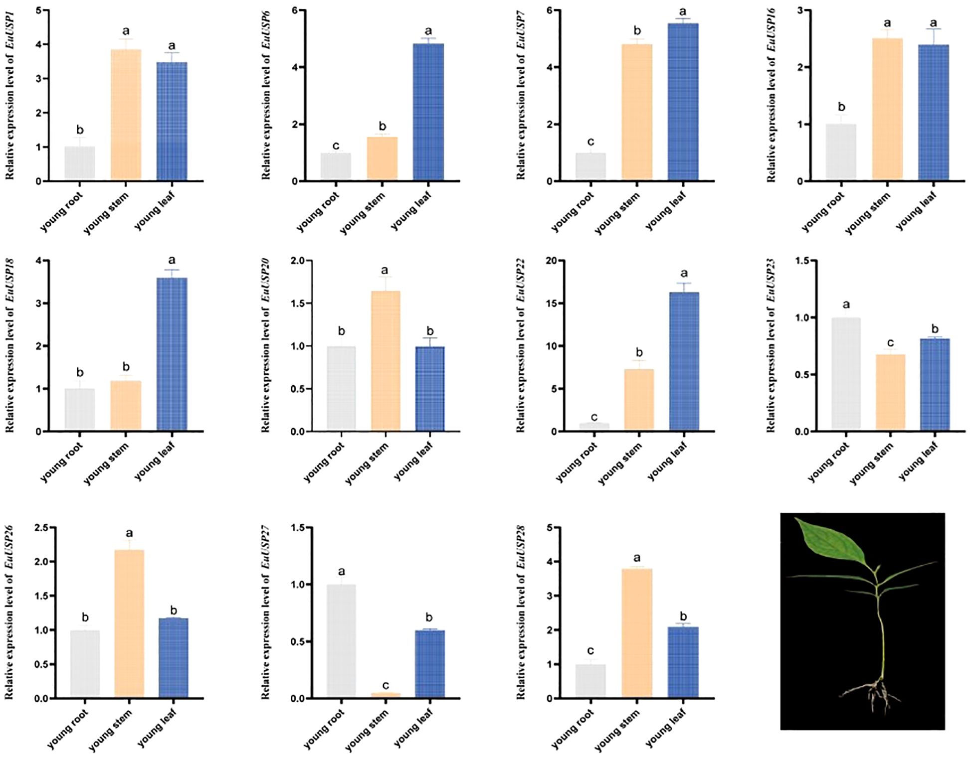 Figure 2. Tissue-specific expression pattern of the EuUSPs gene in E.ulmoides. Different lowercase letters indicate significant differences (P<0.05).