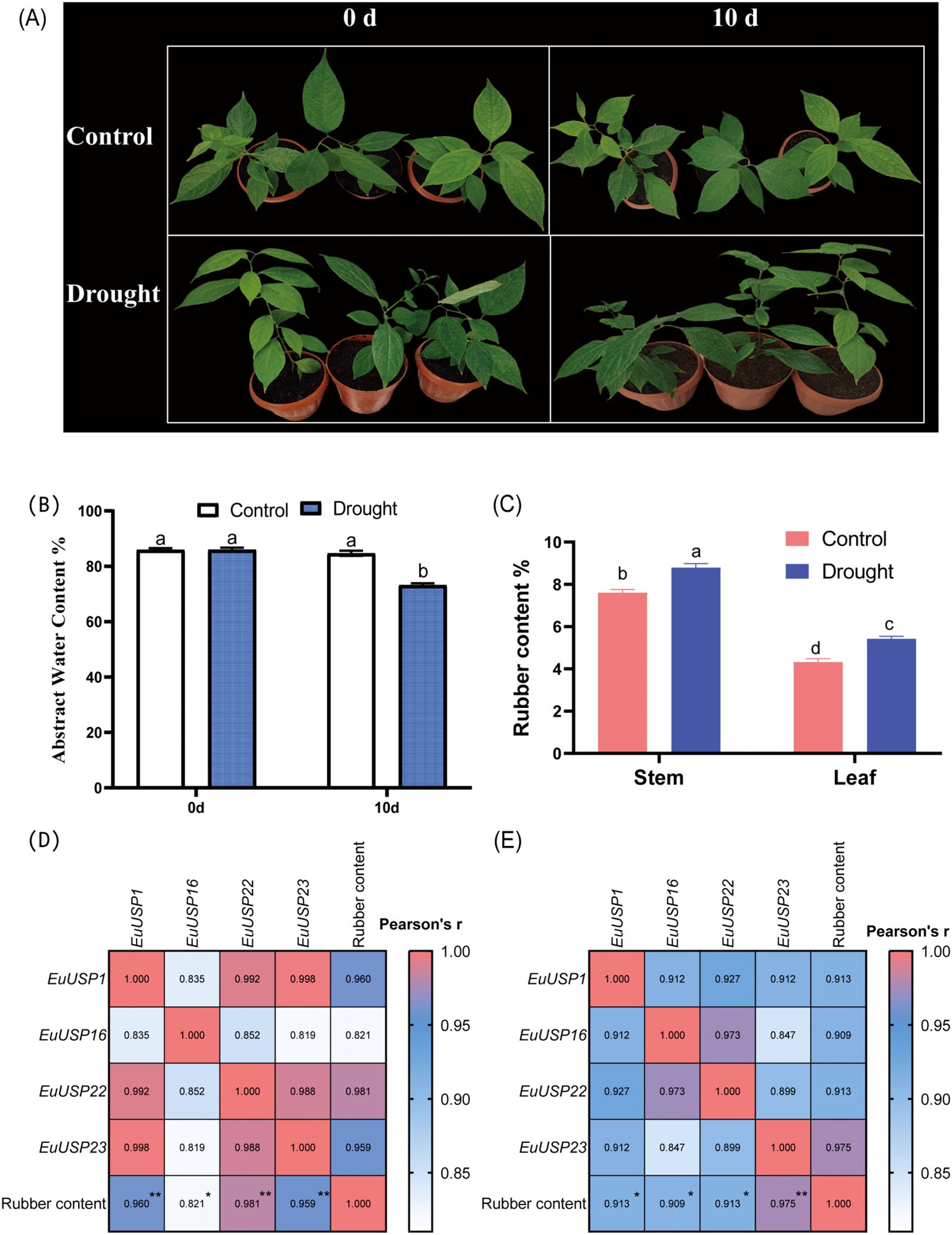 Figure 3. Pearson correlation analysis between EuUSPs gene expression and rubber content under 10-day drought stress. (A) Drought-treated E.ulmoides seedlings. (B) The absolute water content in E. ulmoides leaves before and after drought treatment. (C) Rubber content. (D) Correlation between EuUSPs expression in stems and rubber content. (E) Correlation between EuUSPs expression in leaves and rubber content. Control: negative control. Different lowercase letters indicate significant differences (P<0.05). *P<0.05, **P<0.01, ***P<0.001, ****P<0.0001.