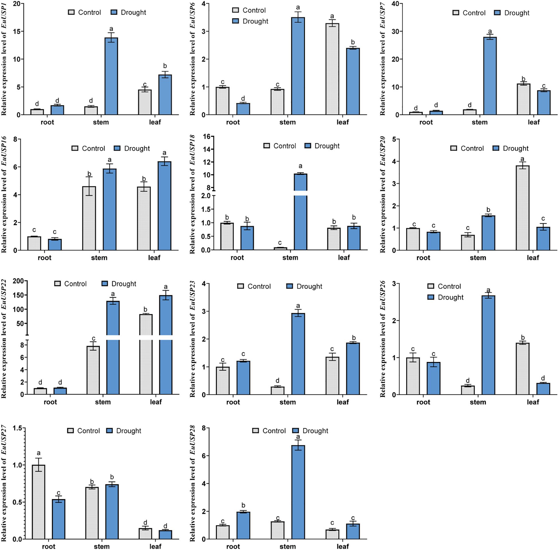 Figure 4. The expression analysis of EuUSPs gene in E.ulmoides after drought treatment. Control: negative control. different lowercase letters indicate significant differences (P<0.05).
