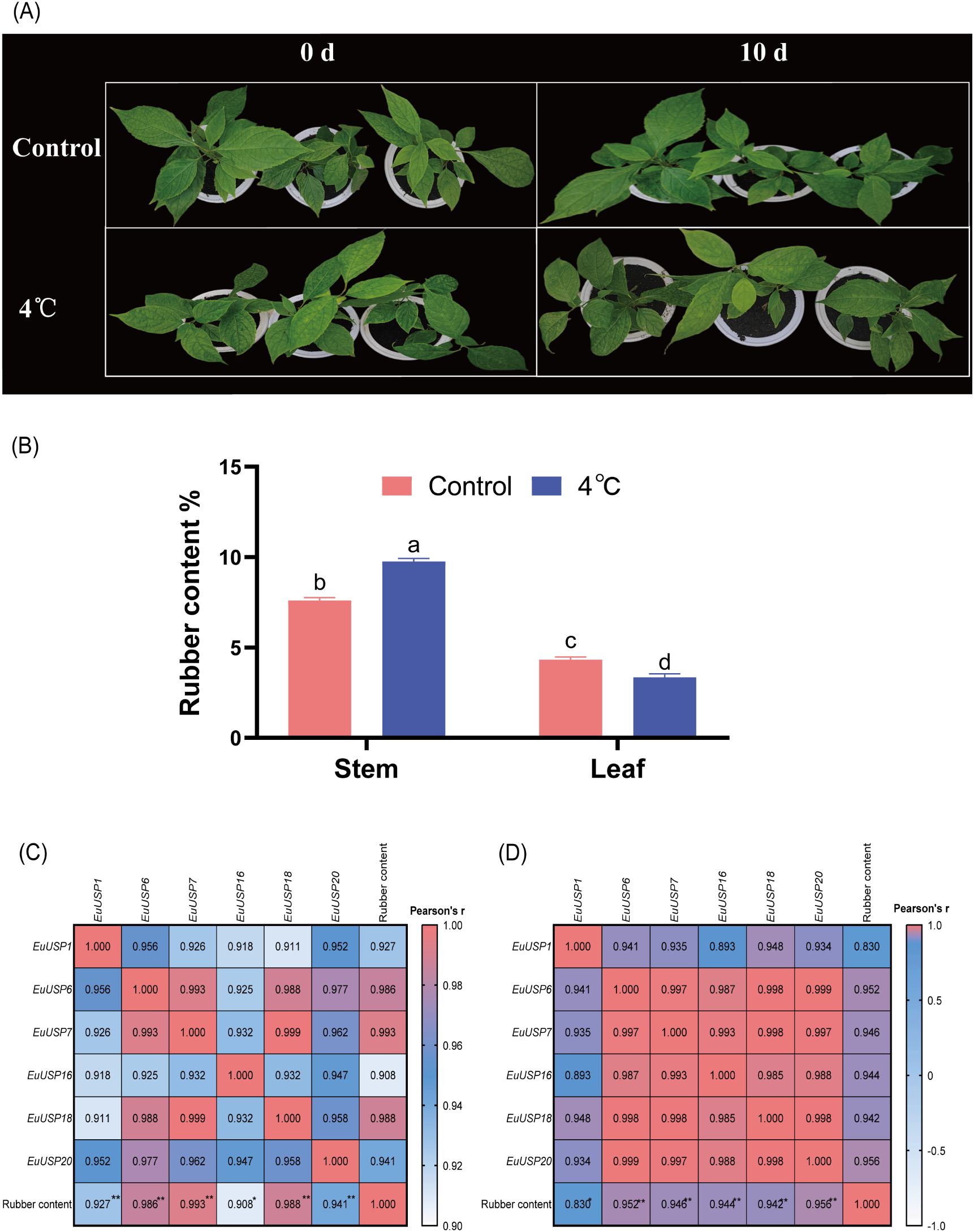 Figure 5. Pearson correlation between EuUSPs gene expression and rubber content under 4°C treatment. (A) 4°C-treated E.ulmoides seedlings (B) Rubber content. (C) Correlation between EuUSPs expression in stems and rubber content. (D) Correlation between EuUSPs expression in leaves and rubber content. Note: Control, negative control. Different lowercase letters indicate significant differences (P<0.05). *P<0.05, **P<0.01, ***P<0.001, ****P<0.0001..