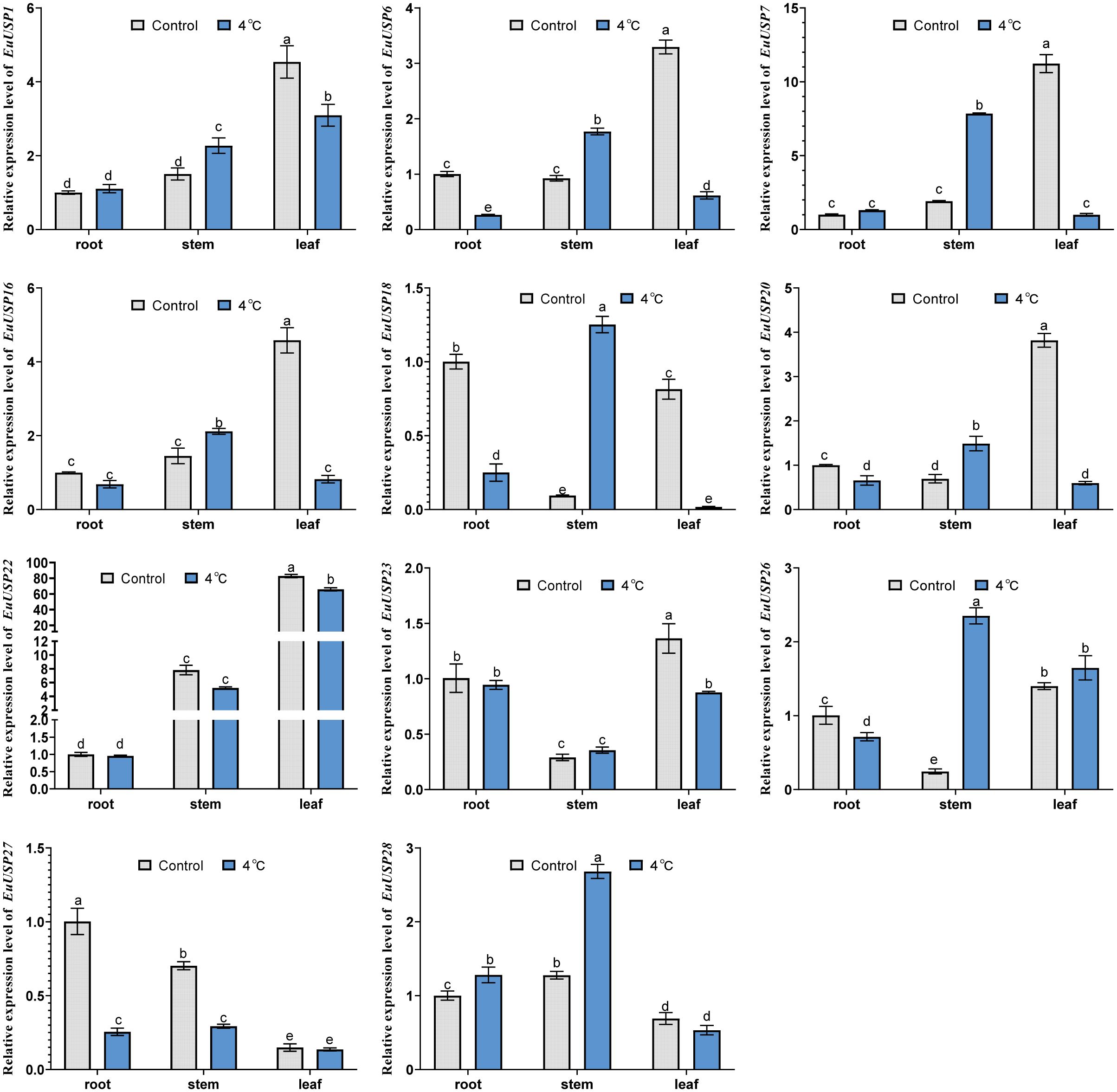 Figure 6. The expression analysis of EuUSPs gene in after 4°C treatment. Control: 25°C treatment. Different lowercase letters indicate significant differences (P<0.05).